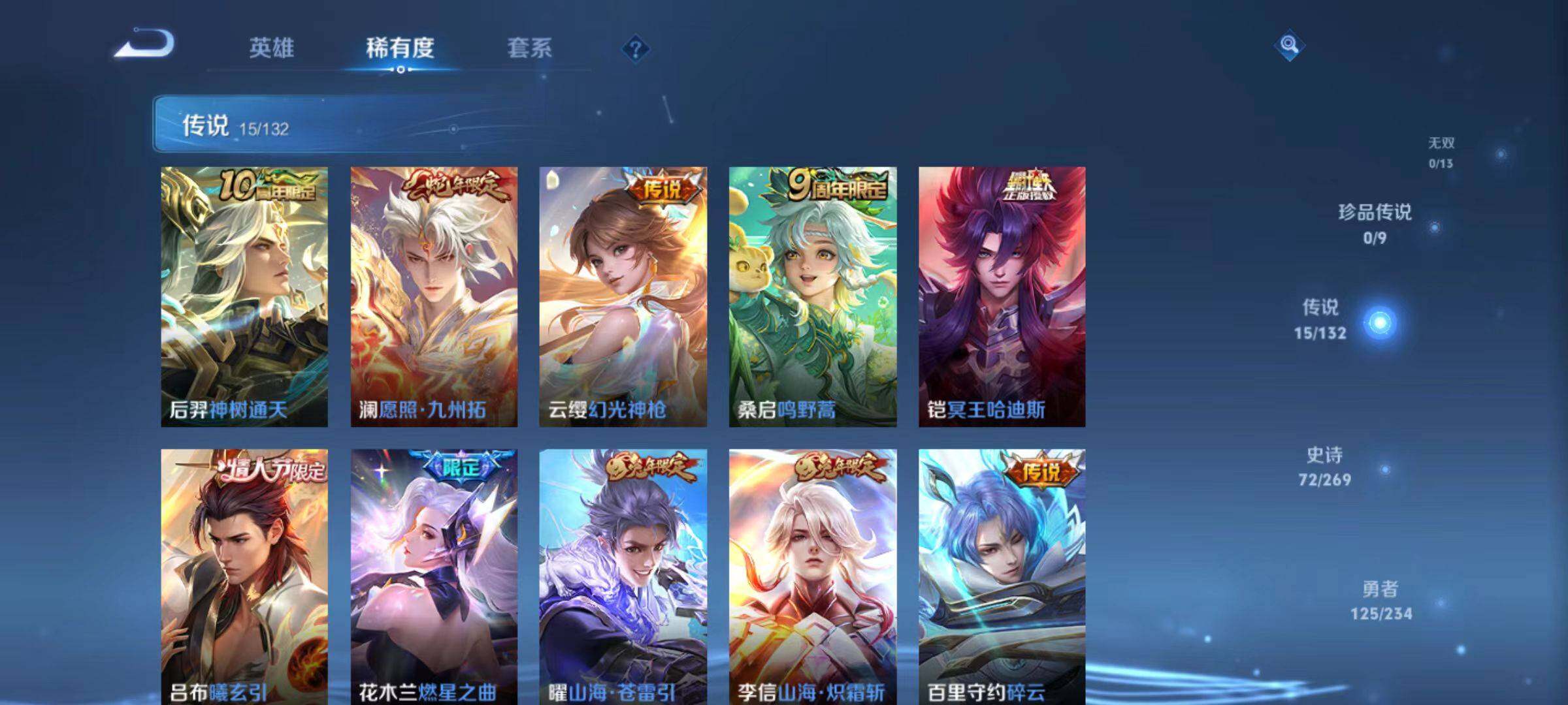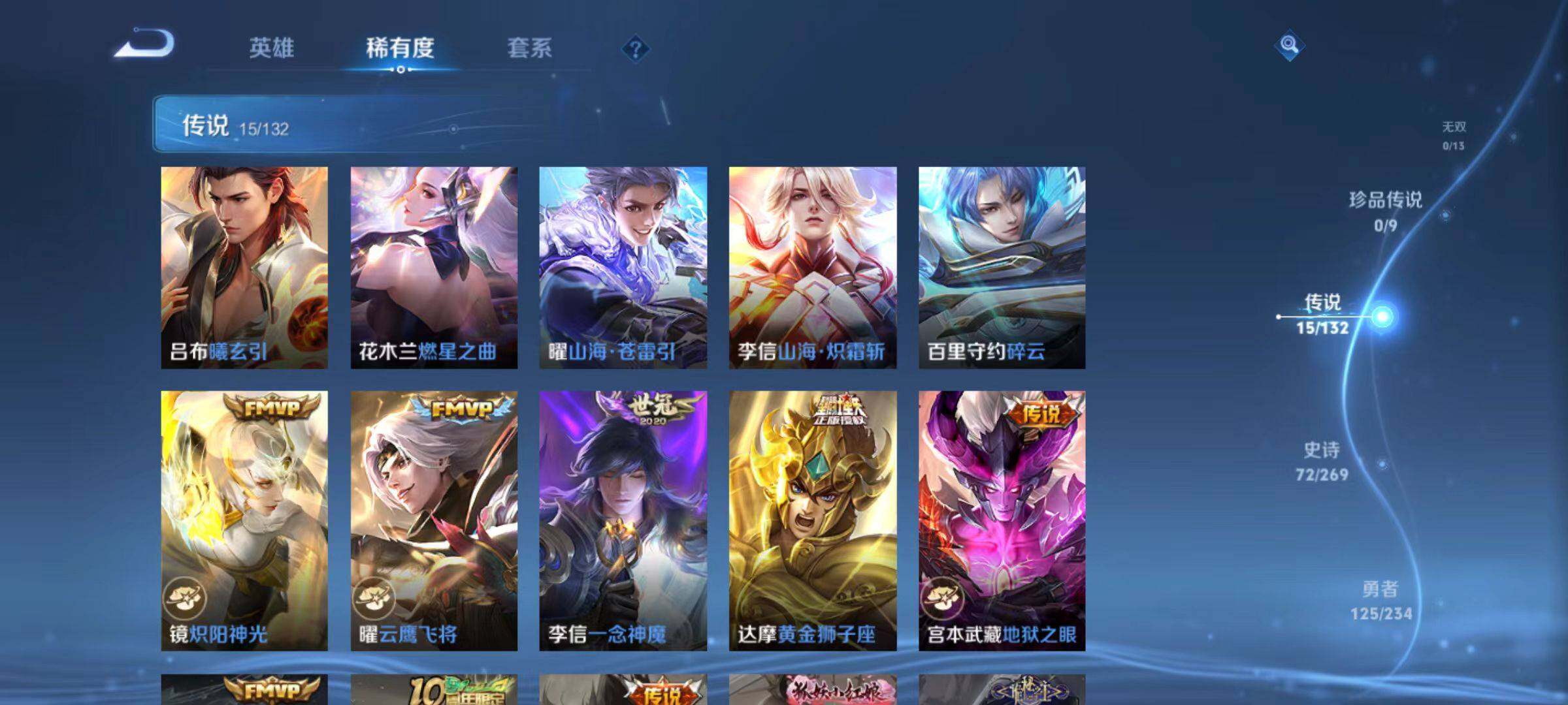 【传说皮肤】:后羿神树通天,澜愿照九州拓,云缨幻光神枪,桑启鸣野蒿,铠冥王哈迪斯,吕布曦玄引,花木兰燃星之曲,曜山海苍雷引,李信山海炽霜斩,百里守约碎云,镜炽阳神光,曜云鹰飞将,李信一念神魔,达摩黄金狮子座,宫本武藏地狱之眼