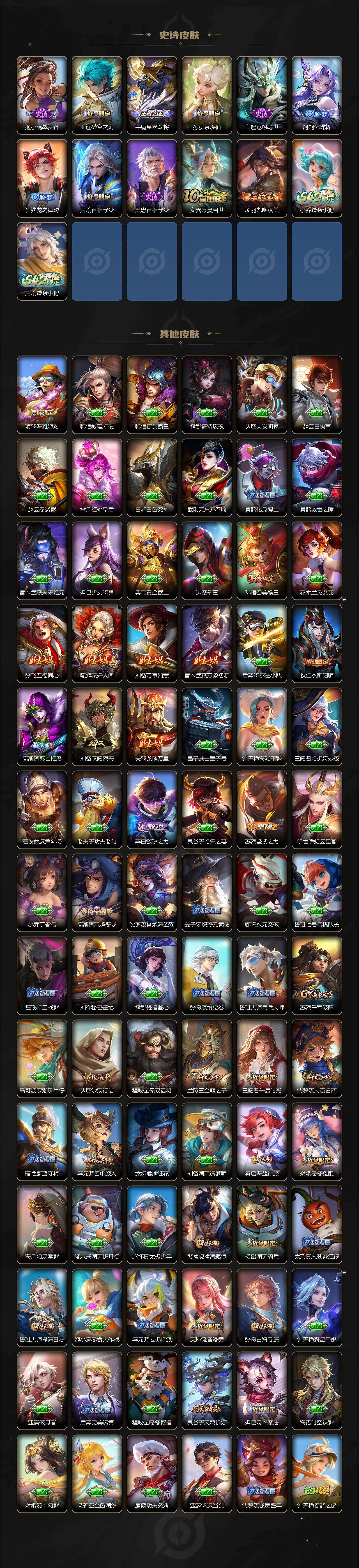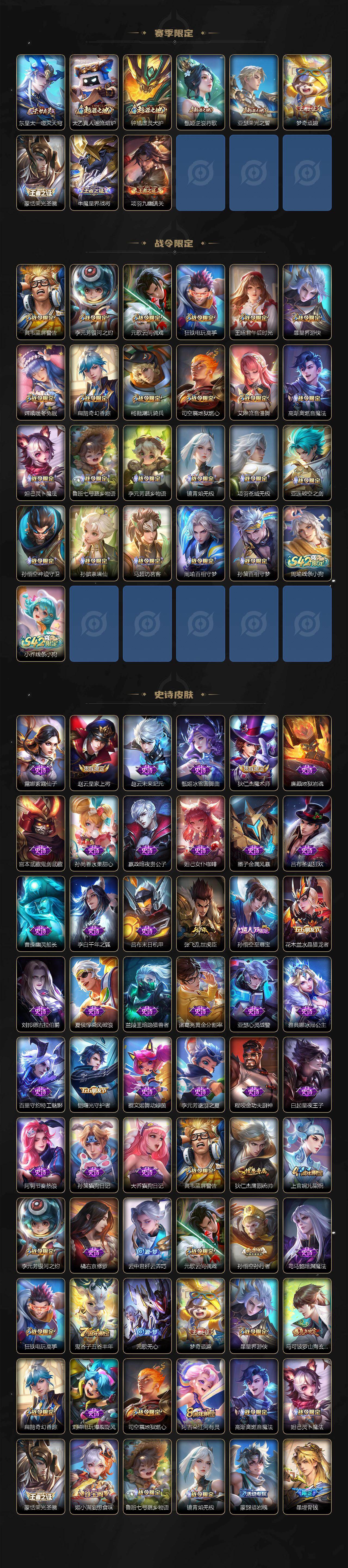 【赛季限定】:苏烈千军破阵,达摩沙漠行僧,兰陵王金庭之子,沈梦溪大漠名商,李元芳云中旅人,桑启海盐诗旅,裴擒虎擒涛扼浪,鲁班大师探海日志,张良古海寻踪,鬼谷子天穹祈灯,刘邦剑破天穹,姜子牙天穹之誓,东皇太一噬灭天穹,太乙真人谧流熔炉,钟馗虚灵犬护,甄姬逆浪荇歌,亚瑟荣光之誓,梦奇顽趣,蒙恬荣光圣徽,牛魔星界战将,项羽九幽镇关