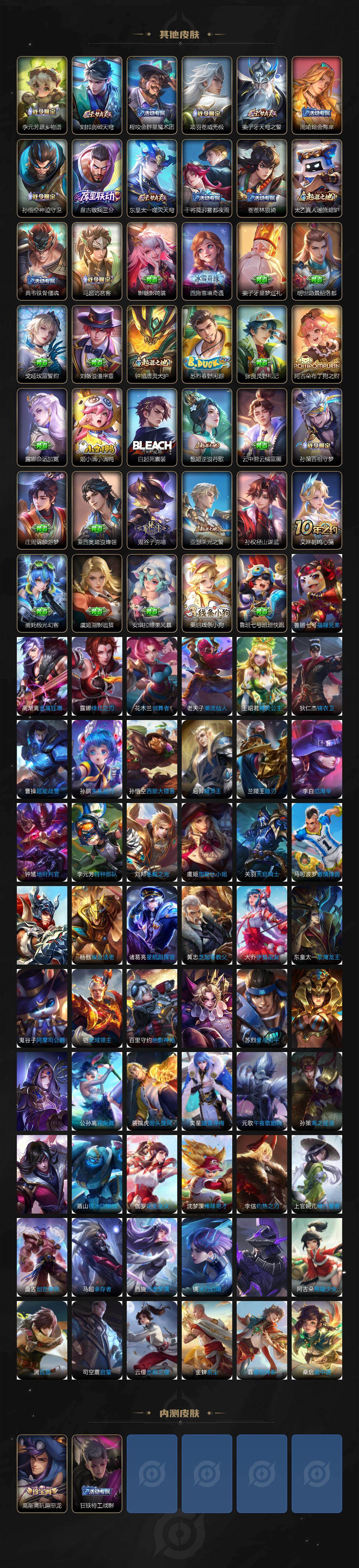 【限定皮肤】:铠冥王哈迪斯,暃埋骨钱,蒙犽顽岩魄,姜子牙天穹之誓,狄仁杰阴阳师,赵云皇家上将,高渐离死亡摇滚,高渐离玩趣恶龙,扁鹊奇幻香踪,元歌云间偶戏,元歌无心,典韦蓝屏警告,马可波罗山海玄木吟,狄仁杰魔术师,达摩沙漠行僧,项羽海滩派对,王昭君午后时光,兰陵王金庭之子,花木兰燃星之曲,孙悟空美猴王,孙悟空至尊宝,孙悟空孙行者,李元芳银河之约,李元芳云中旅人,杨戬潮玩骑兵,鬼谷子五谷丰年,苏烈千军破阵,梦奇顽趣,沈梦溪大漠名商,裴擒虎擒涛扼浪,狂铁电玩高手,云中君纤云弄巧,李信山海炽霜斩,上官婉儿梁祝,嫦娥暖冬兔眠,曜山海苍雷引,鲁班大师探海日志,桑启海盐诗旅,暃星界游侠,艾琳流音漫舞,司空震地狱燃心,阿古朵江河有灵,张良古海寻踪,蒙恬荣光圣徽,高渐离燃音魔法,妲己灵卜魔法,鬼谷子天穹祈灯,姬小满妄想食味,吕布曦玄引,沈梦溪龙舞盛年,鲁班七号蔬乡物语,李元芳蔬乡物语,刘邦剑破天穹,程咬金群星魔术团,镜青焰无极,项羽苍威无极,周瑜熔金海岸