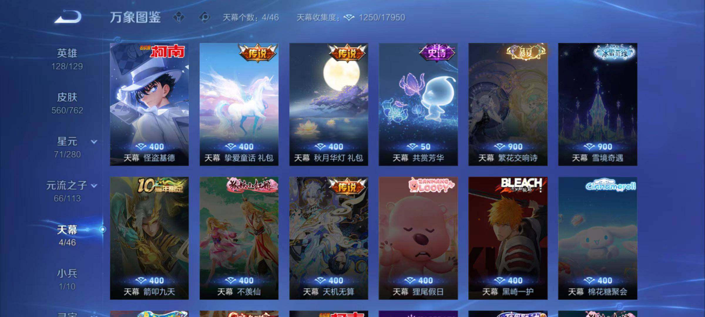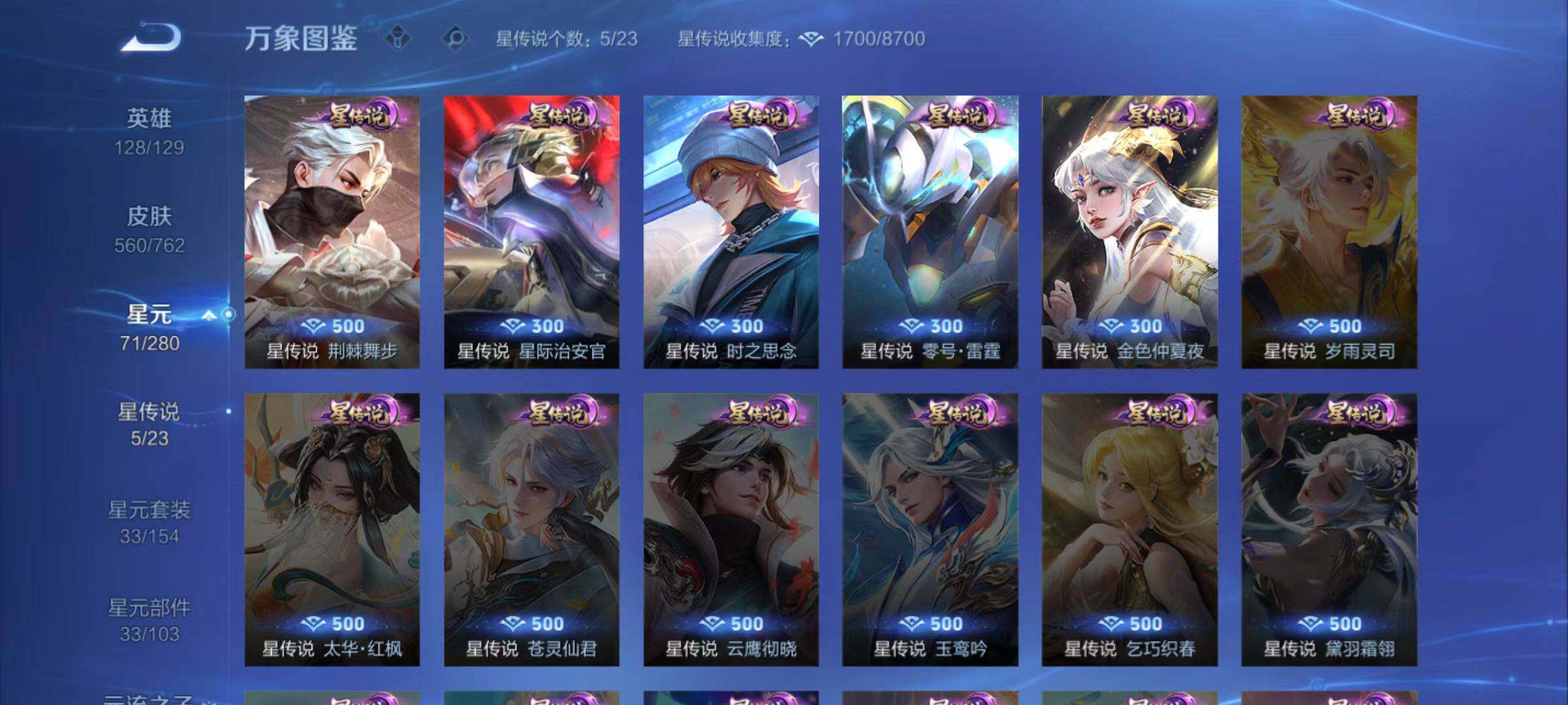 明世隐疑决卦,老夫子醍醐杖,鬼谷子原初探秘者,狄仁杰万华元夜,程咬金演武夺筹,钟馗驱傩正仪,苏烈千军破阵,女娲朔望之晖,典韦蓝屏警告,钟馗神迹守卫,沈梦溪星空之诺,李元芳银河之约,刘邦夺宝奇兵,马可波罗暗影游猎,蒙犽狂想玩偶喵,元歌云间偶戏,弈星混沌棋,达摩沙漠行僧,兰陵王金庭之子,沈梦溪大漠名商,李元芳云中旅人,桑启海盐诗旅,鲁班大师探海日志,张良古海寻踪,项羽苍威无极,镜青焰无极