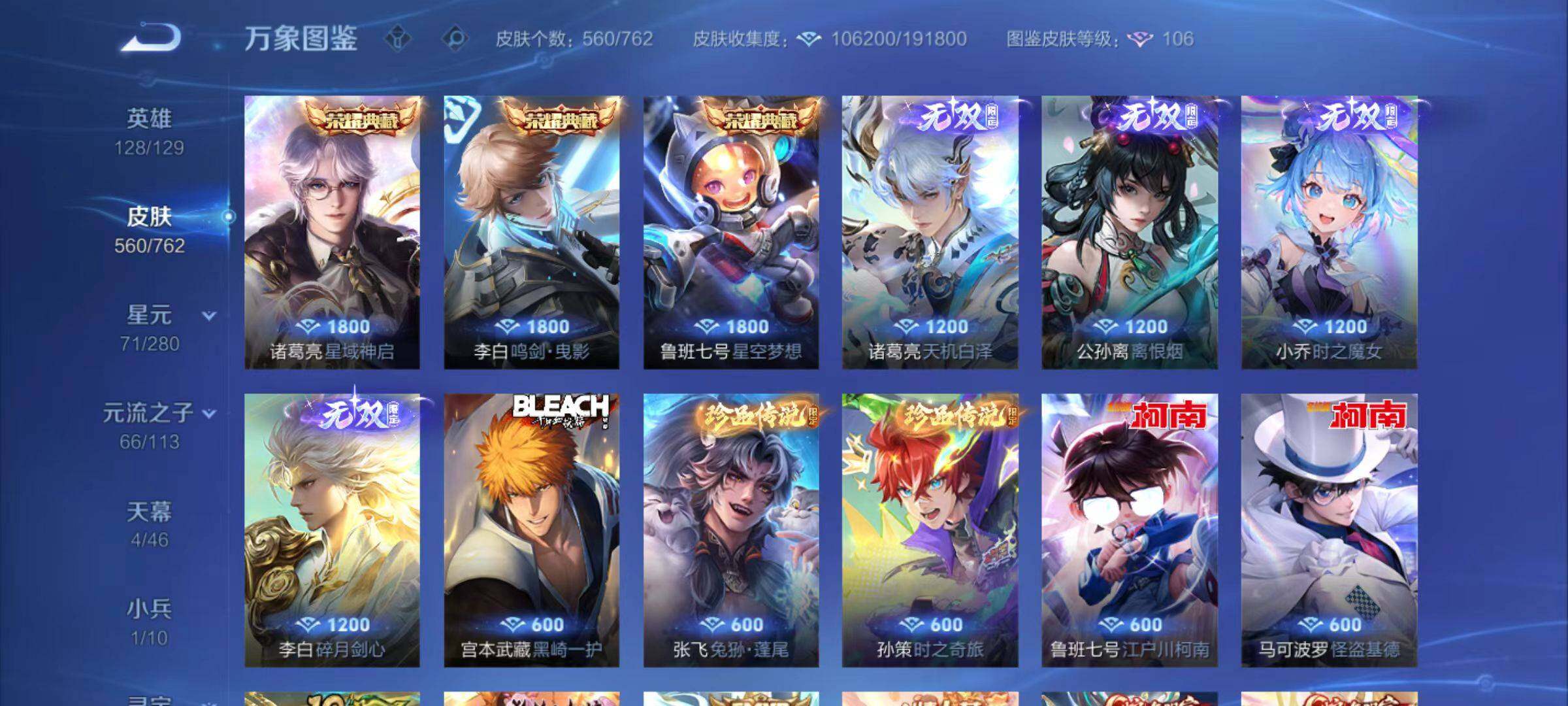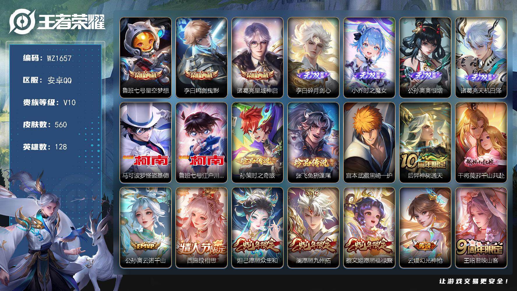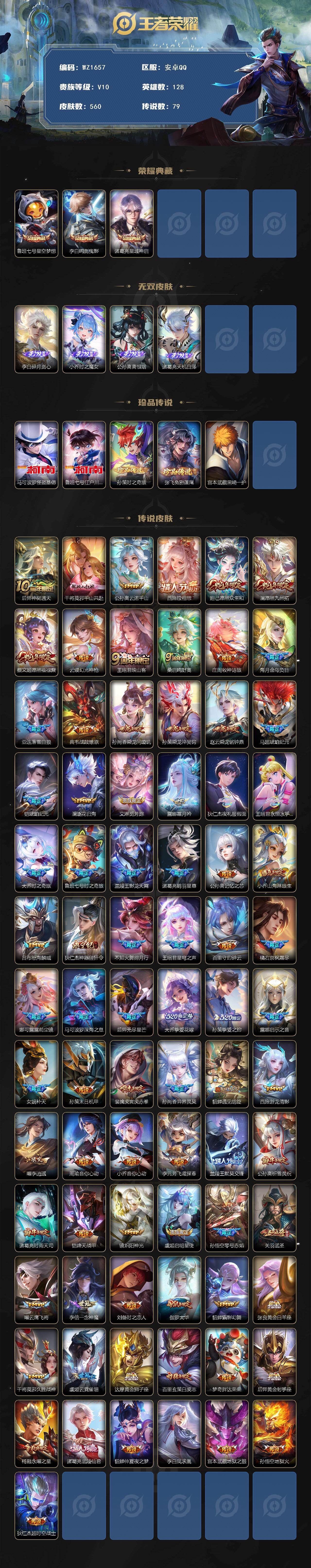 [16507104]安卓Q-V10-128英雄-560皮肤-3典藏皮肤-4无双-5珍品传说-79传说-185史诗