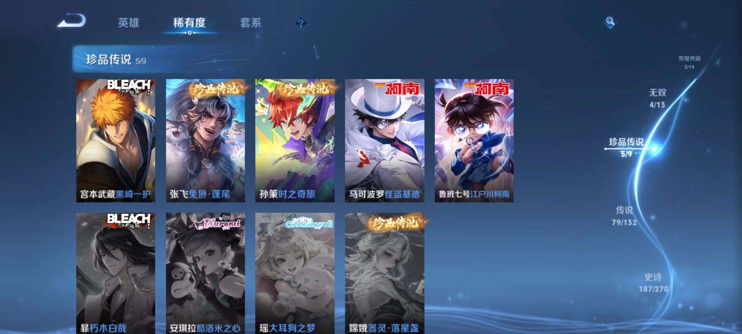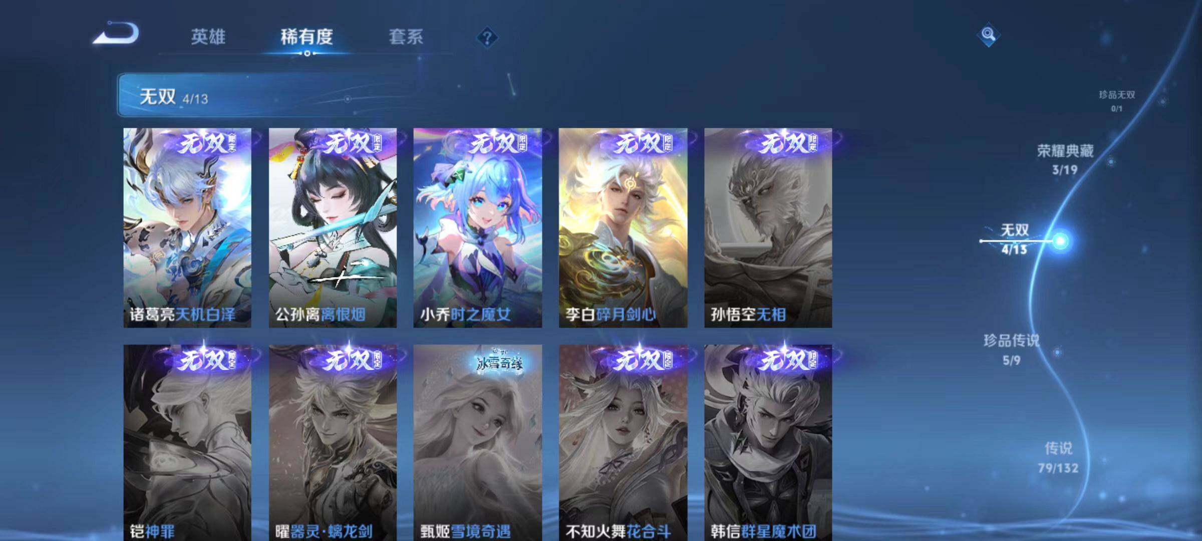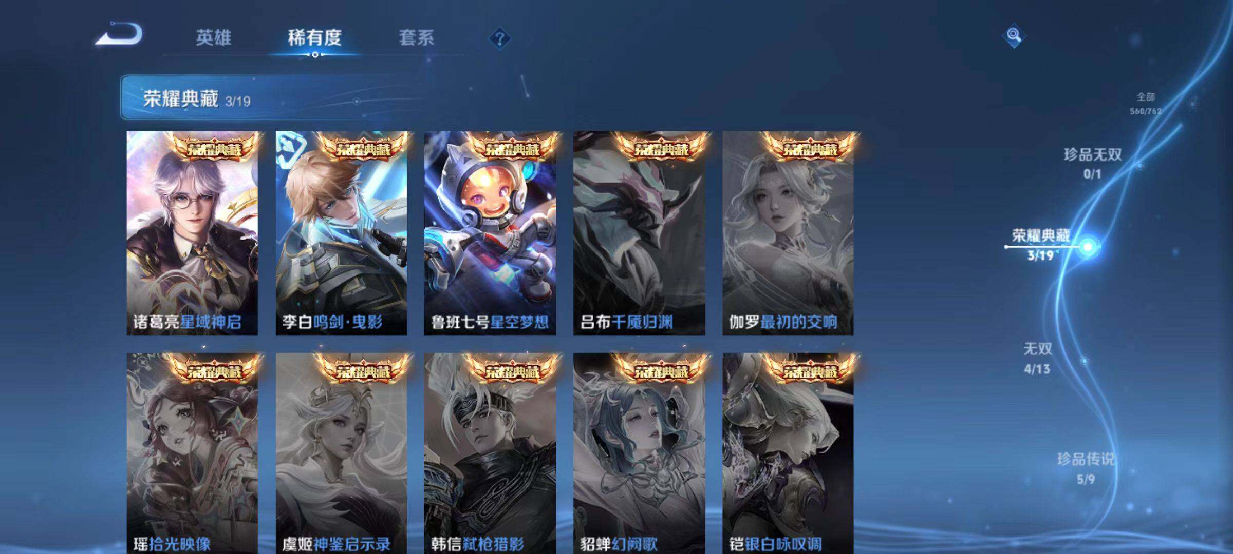 [16507104]安卓Q-V10-128英雄-560皮肤-3典藏皮肤-4无双-5珍品传说-79传说-185史诗