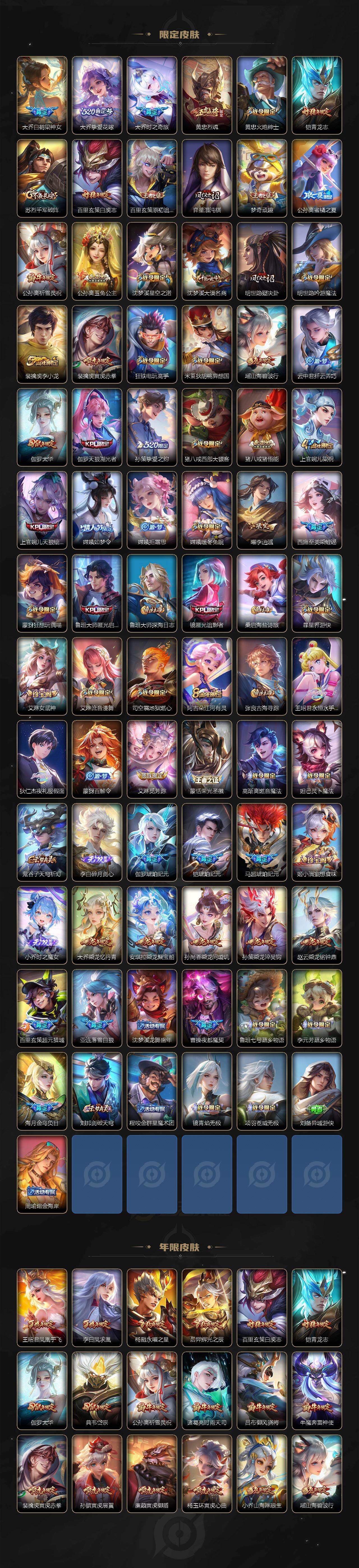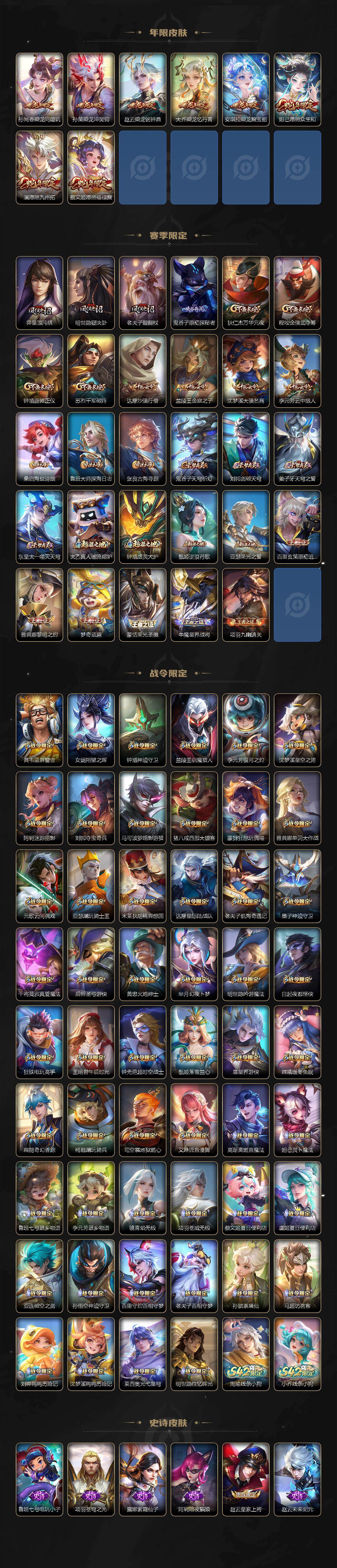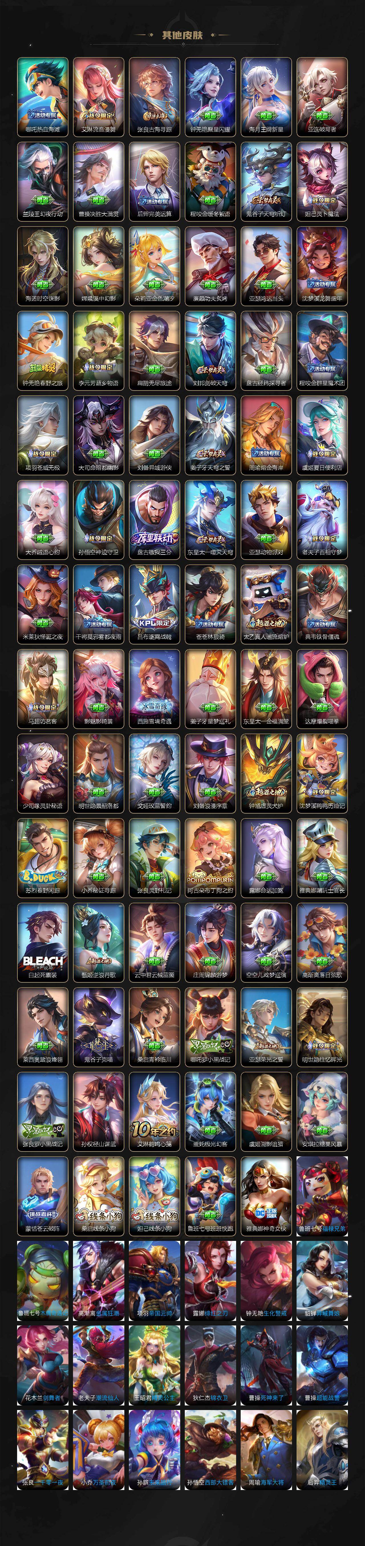 关羽冰锋战神,裴擒虎李小龙,上官婉儿梁祝,牛魔奔雷神使,公孙离祈雪灵祝,吕布御风骁将,诸葛亮时雨天司,赵云龙胆,关羽武圣,黄忠烈魂,马超神威,后羿辉光之辰,典韦岱宗,伽罗太华,孙膑天狼运算者,上官婉儿天狼绘梦者,伽罗天狼溯光者,马可波罗逐梦之星,韩信逐梦之影,铠青龙志,百里玄策白虎志,王昭君凤凰于飞,项羽霸王别姬,虞姬霸王别姬,露娜一生所爱,花木兰默契交锋,兰陵王默契交锋,后羿如梦令,嫦娥如梦令,孙悟空至尊宝,雅典娜神奇女侠,干将莫邪冰霜恋舞曲,花木兰青春决赛季,蔡文姬奇迹圣诞,妲己时之彼端,公孙离蜜橘之夏,芈月白晶晶,庄周云端筑梦师,鲁班七号乒乒小将,大乔白鹤梁神女,猪八戒猪悟能,廉颇寅虎·御盾,孙尚香异界灵契,孙悟空孙行者,镜匿光追影者,韩信傲雪梅枪,孙膑寅虎·展翼,杨玉环寅虎·心曲,裴擒虎寅虎·赤拳,女娲补天,赵云百木心枪,公孙离玉兔公主,露娜启示之音,后羿无尽星芒,马可波罗深海之息,娜可露露前尘镜,橘右京枫霜尽,鲁班大师匿光启智者,王昭君星穹之声,不知火舞绯月行,瑶山海·碧波行,兰陵王影龙天霄,西施至美·乘鲤谣,桑启鸣野蒿,艾琳陌上桑,王昭君映山客,澜愿照·九州拓,蔡文姬愿照·福禄聚,妲己愿照·众生和