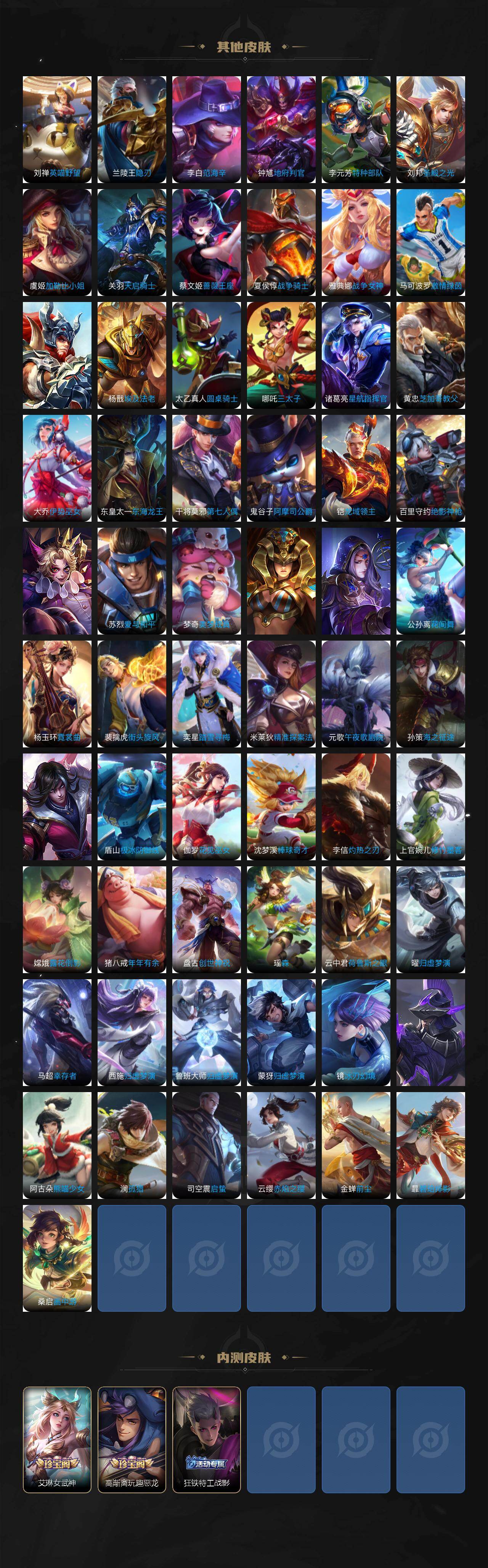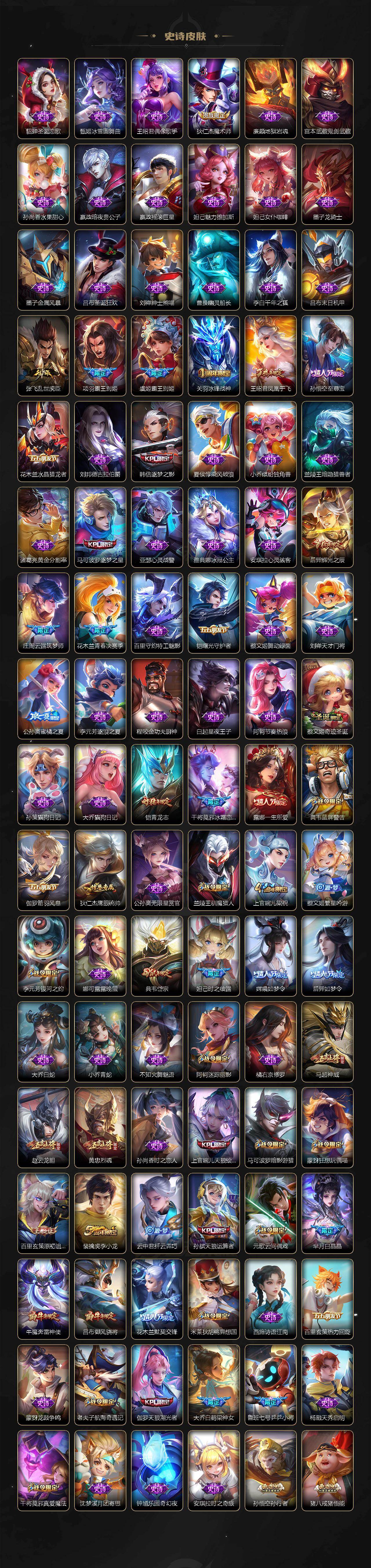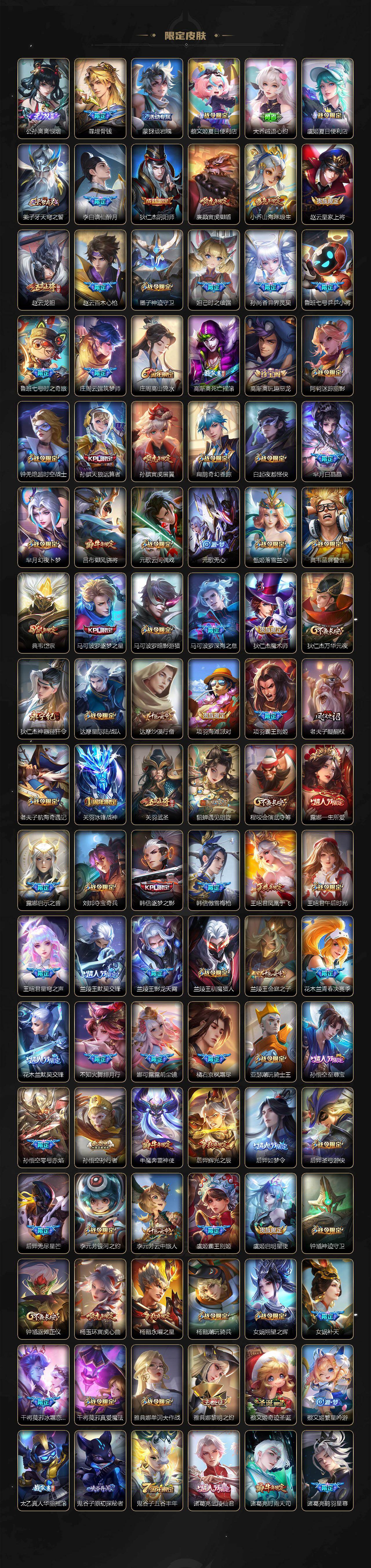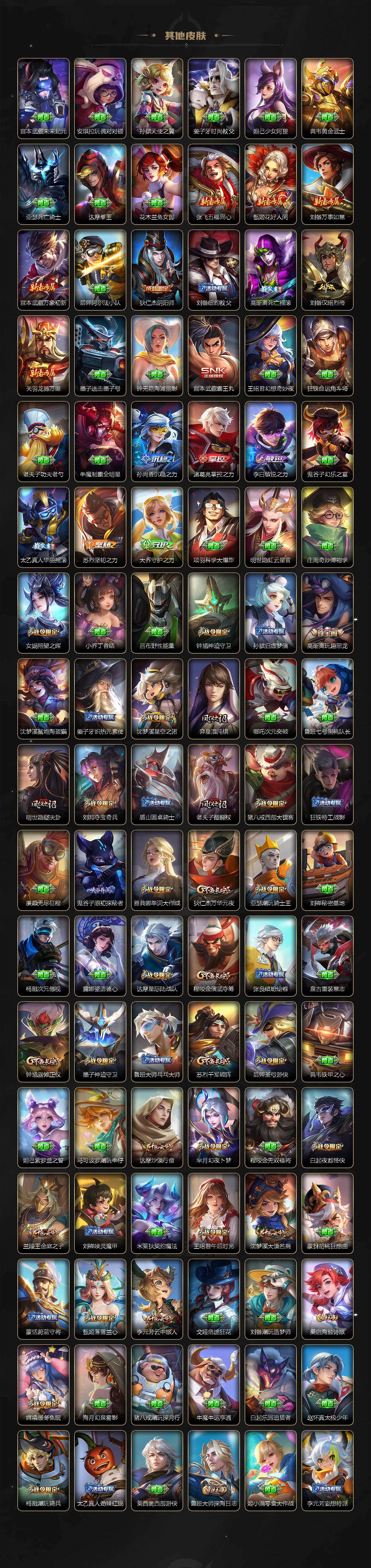 关羽冰锋战神,裴擒虎李小龙,上官婉儿梁祝,牛魔奔雷神使,公孙离祈雪灵祝,吕布御风骁将,诸葛亮时雨天司,赵云龙胆,关羽武圣,黄忠烈魂,马超神威,后羿辉光之辰,典韦岱宗,伽罗太华,孙膑天狼运算者,上官婉儿天狼绘梦者,伽罗天狼溯光者,马可波罗逐梦之星,韩信逐梦之影,铠青龙志,百里玄策白虎志,王昭君凤凰于飞,项羽霸王别姬,虞姬霸王别姬,露娜一生所爱,花木兰默契交锋,兰陵王默契交锋,后羿如梦令,嫦娥如梦令,孙悟空至尊宝,雅典娜神奇女侠,干将莫邪冰霜恋舞曲,花木兰青春决赛季,蔡文姬奇迹圣诞,妲己时之彼端,公孙离蜜橘之夏,芈月白晶晶,庄周云端筑梦师,鲁班七号乒乒小将,大乔白鹤梁神女,猪八戒猪悟能,廉颇寅虎·御盾,孙尚香异界灵契,孙悟空孙行者,镜匿光追影者,韩信傲雪梅枪,孙膑寅虎·展翼,杨玉环寅虎·心曲,裴擒虎寅虎·赤拳,女娲补天,赵云百木心枪,公孙离玉兔公主,露娜启示之音,后羿无尽星芒,马可波罗深海之息,娜可露露前尘镜,橘右京枫霜尽,鲁班大师匿光启智者,王昭君星穹之声,不知火舞绯月行,瑶山海·碧波行,兰陵王影龙天霄,西施至美·乘鲤谣,桑启鸣野蒿,艾琳陌上桑,王昭君映山客,澜愿照·九州拓,蔡文姬愿照·福禄聚,妲己愿照·众生和