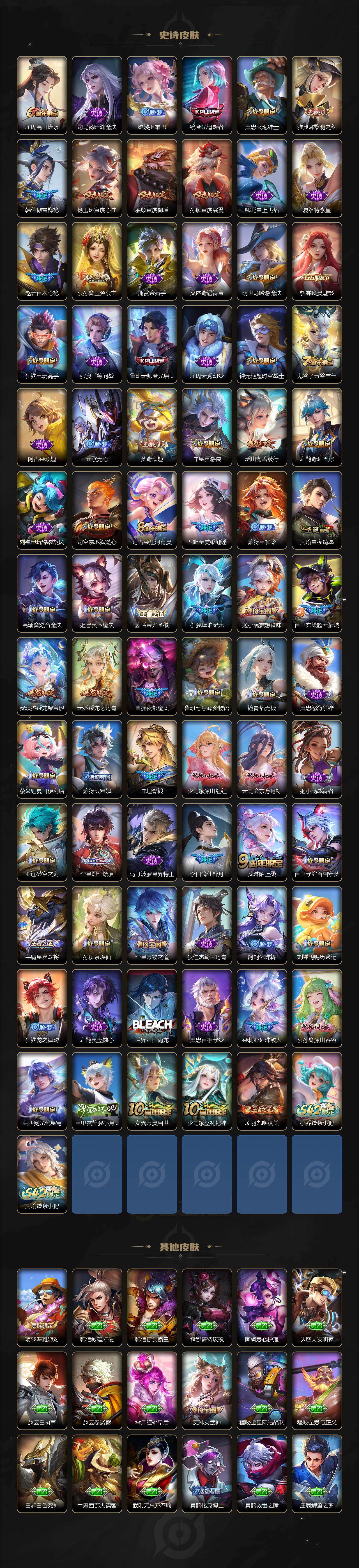 【英雄全皮】:刘禅全皮,狄仁杰全皮,达摩全皮,露娜全皮,孙权全皮,艾琳全皮,娜可露露全皮,橘右京全皮,钟馗全皮,雅典娜全皮,诸葛亮全皮,大乔全皮,黄忠全皮,百里玄策全皮,公孙离全皮,猪八戒全皮,蒙犽全皮,鲁班大师全皮,蒙恬全皮,阿古朵全皮,空空儿全皮,影全皮,少司缘全皮
