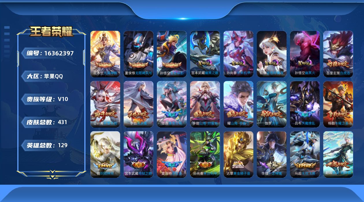 [16362397]【店主推荐捡漏号!可直接换绑】苹果Q-V10-最强王者段位-129英雄-431皮肤-3典藏皮肤-1典藏英雄-56传说-138史诗-4星元
