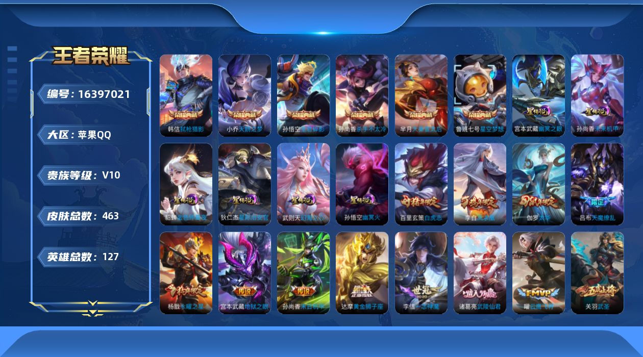 [16397021]【特价出售/店主推荐/36段打野/1省标/2市标】:苹果Q-V10-最强王者段位-127英雄-462皮肤-6典藏皮肤-1典藏英雄-6星元-29传说-148史诗
