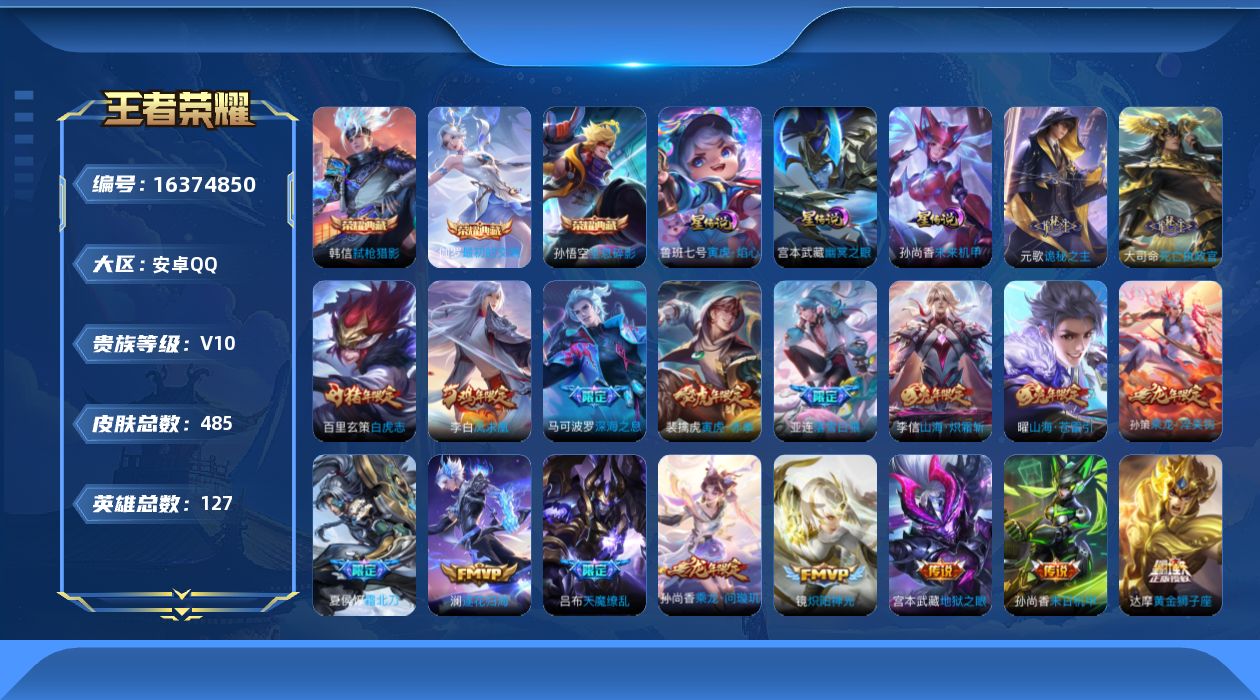 [16374850]【特价出售/店主推荐】中路43段、对抗路37段、发育路35段、游走35段,安卓Q-V10-最强王者段位-127英雄-485皮肤-3典藏皮肤-3星传说-54传说-164史诗