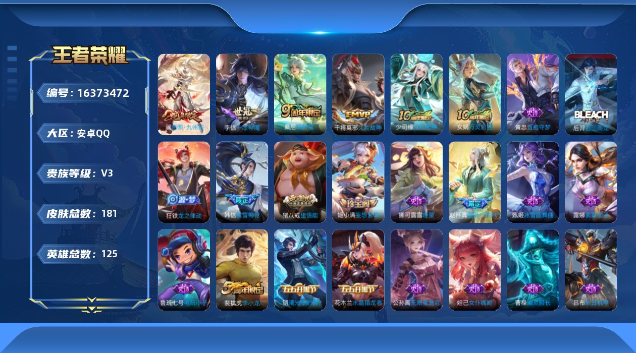 [16373472]【特价出售/店主推荐/6209星币可兑换星元皮肤/1省标/3市标/30段打野】:安卓Q-V4-最强王者段位-125英雄-181皮肤-5传说-57史诗