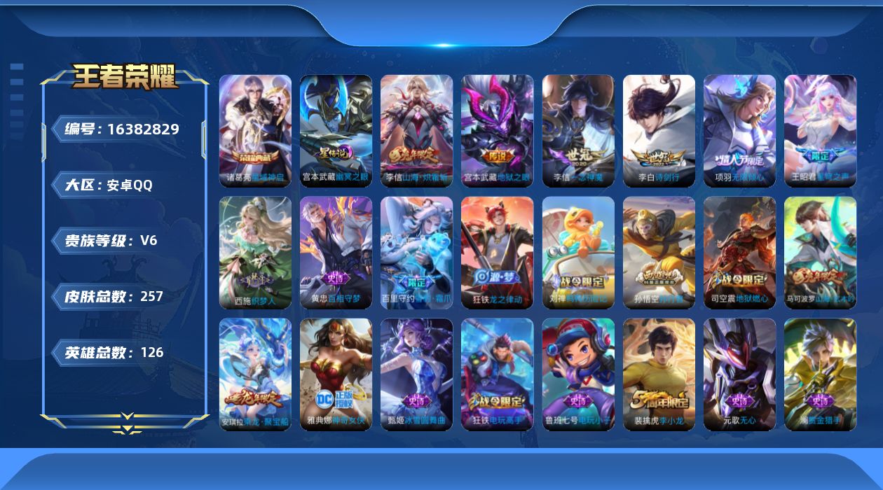 [16382829]【店主推荐捡漏号!可直接换绑】安卓Q-V7-永恒钻石IV段位-126英雄-257皮肤-1典藏皮肤-6传说-64史诗-1星元