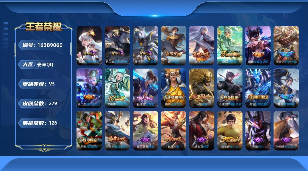 [16389060]可二次【特价出售/店主推荐】:安卓Q-V7-最强王者段位-126英雄-279皮肤-3星元-7传说-67史诗 【传说皮肤】:后羿神树通天,桑启鸣野蒿,曜李逍遥 ,孙悟空零号赤焰,貂蝉仲夏夜之梦,李白凤求凰,狄仁杰超时空战士 【限定皮肤】:白起狰,大乔绒语心约,狄仁杰阴阳师,虞姬凯尔特女王,赵云皇家上将,墨子神迹守卫,嬴政优雅恋人,嬴政白昼王子,孙尚香蔷薇恋人,鲁班七号狮舞东方,鲁班七号乒乒小将,庄周高山流水,阿轲迷踪丽影,孙膑妖精王,扁鹊炼金王,芈月重明,芈月幻夜卜梦,吕布猎兽之王,吕布御风骁将,周瑜赤莲之焰,元歌云间偶戏,元歌无心,夏侯惇朔风刀,甄姬游园惊梦,曹操烛龙,典韦穷奇,典韦蓝屏警告,马可波罗暗影游猎,狄仁杰魔术师,狄仁杰万华元夜,达摩星际陆战队,达摩沙漠行僧,项羽海滩派对,老夫子醍醐杖,老夫子航海奇遇记,关羽冰锋战神,程咬金演武夺筹,刘邦夺宝奇兵,韩信逐梦之影,韩信飞衡,韩信傲雪梅枪,兰陵王驯魔猎人,兰陵王金庭之子,亚瑟潮玩骑士王,孙悟空至尊宝,孙悟空零号赤焰,牛魔御旌,后羿圣弓游侠,李元芳银河之约,李元芳云中旅人,钟馗神迹守卫,钟馗驱傩正仪,杨玉环遇见飞天,女娲朔望之晖,干将莫邪真爱魔法,雅典娜单词大作战,雅典娜黎明之约,蔡文姬繁星吟游,太乙真人饕餮,鬼谷子原初探秘者,鬼谷子五谷丰年,黄忠火炮绅士,苏烈千军破阵,百里玄策原初追逐者,弈星混沌棋,沈梦溪星空之诺,沈梦溪大漠名商,明世隐疑决卦,裴擒虎李小龙,裴擒虎擒涛扼浪,狂铁御狮,米莱狄御霄,米莱狄胡桃异想国,云中君纤云弄巧,伽罗天狼溯光者,盾山御銮,猪八戒西部大镖客,上官婉儿梁祝,嫦娥拒霜思,曜李逍遥 ,蒙犽狂想玩偶喵,鲁班大师探海日志,镜匿光追影者,桑启海盐诗旅,阿古朵江河有灵,张良古海寻踪,蒙犽百解令,沈梦溪龙舞盛年,周瑜熔金海岸 【年限皮肤】:李白凤求凰,吕布御风骁将,韩信飞衡,马超神威 【赛季限定】:孙膑妖精王,扁鹊炼金王,白起狰,芈月重明,夏侯惇朔风刀,曹操烛龙,典韦穷奇,狄仁杰万华元夜,达摩沙漠行僧,老夫子醍醐杖,程咬金演武夺筹,兰陵王金庭之子,张良古海寻踪,牛魔御旌,李元芳云中旅人,虞姬凯尔特女王,钟馗驱傩正仪,雅典娜黎明之约,太乙真人饕餮,鬼谷子原初探秘者,苏烈千军破阵,百里玄策原初追逐者,弈星混沌棋,沈梦溪大漠名商,明世隐疑决卦,裴擒虎擒涛扼浪,狂铁御狮,米莱狄御霄,盾山御銮,鲁班大师
