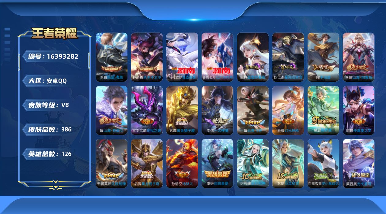 [16393282]【特价急出/详情看图】安卓Q-V8-最强王者段位-126英雄-386皮肤-2典藏皮肤-2珍品传说-2星元-15传说-124史诗