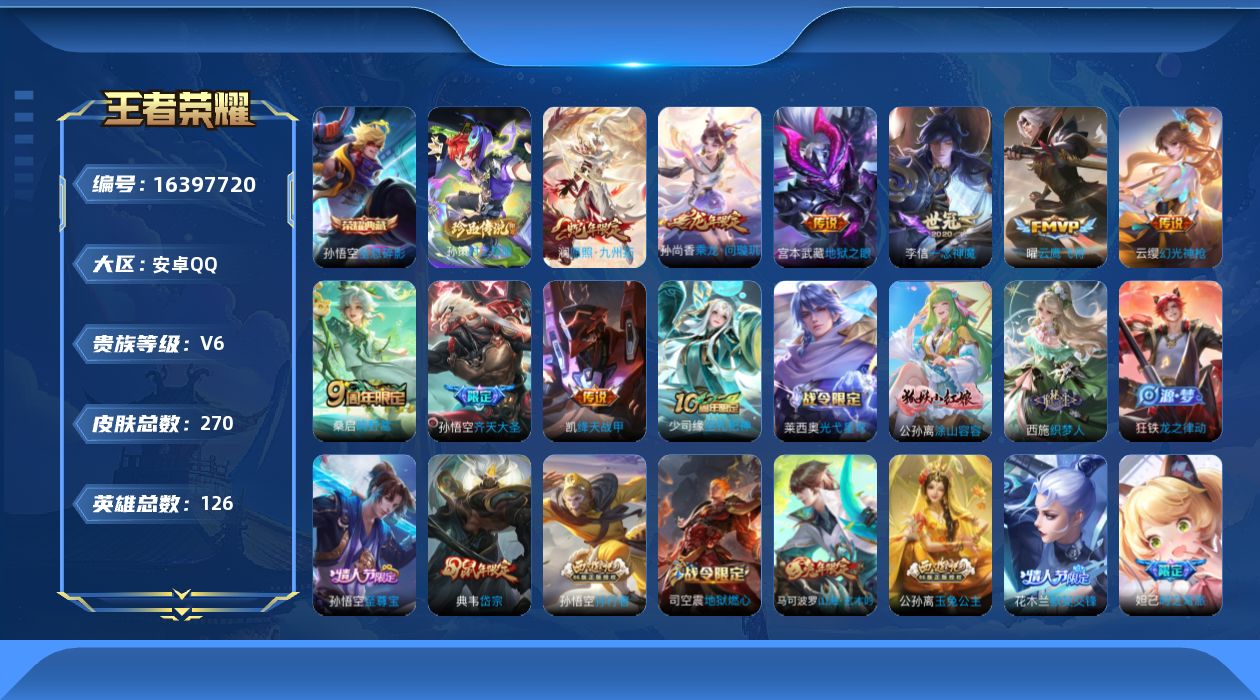 [16397720]【特价出售/店主推荐】安卓Q-V6-最强王者段位-126英雄-270皮肤-1典藏皮肤-1珍品传说-10传说-83史诗