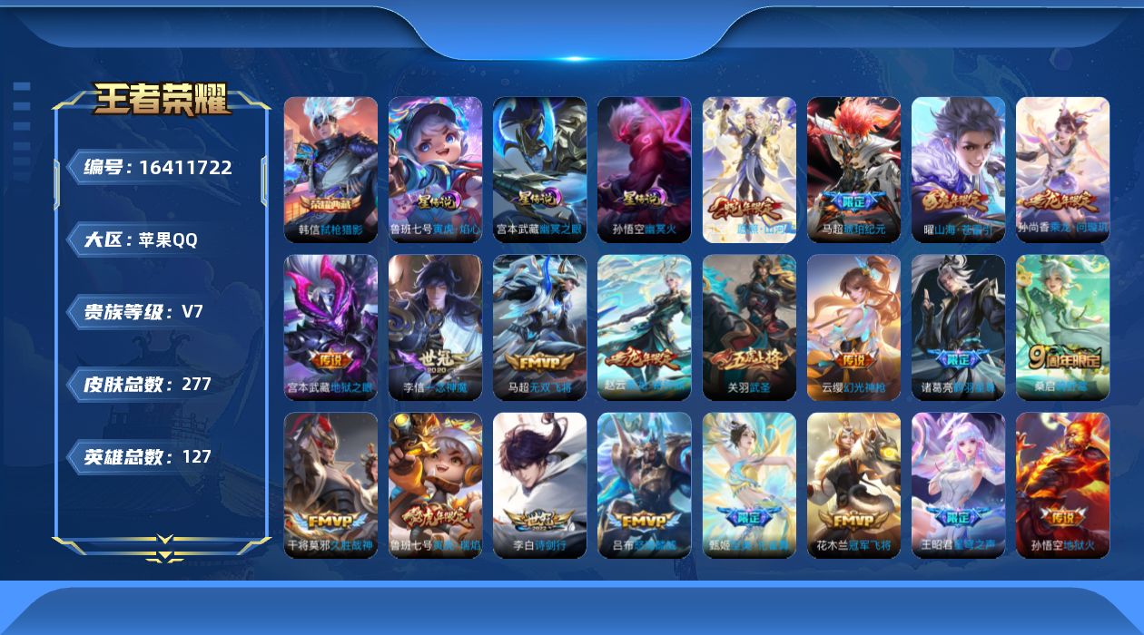 [16411722]【特价急出/详情看图】苹果Q-V7-最强王者段位-127英雄-277皮肤-1典藏皮肤-3星元-23传说-87史诗