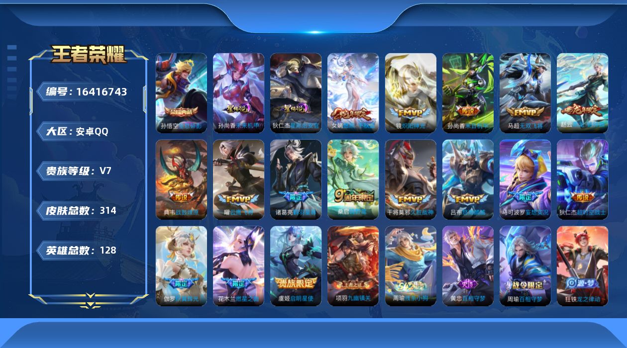 [16416743]【店主推荐捡漏号!可直接换绑】安卓Q-V8-永恒钻石I段位-128英雄-314皮肤-1典藏皮肤-17传说-78史诗-2星元 【英雄全皮】:孙权全皮,戈娅全皮,影全皮 【荣耀典藏】:孙悟空全息碎影 【传说皮肤】:后羿神树通天,女娲愿照千秋盛,桑启鸣野蒿,典韦战鼓燎原,赵云乘龙铭钟鼎,马可波罗妄想实况,诸葛亮鹤羽星尊,花木兰燃星之曲,伽罗炽翼辉光,吕布怒海麟威,马超无双飞将,镜炽阳神光,虞姬启明星使,曜云鹰飞将,干将莫邪久胜战神,孙尚香末日机甲,狄仁杰超时空战士 【限定皮肤】:白起狰,蔡文姬夏日便利店,大乔绒语心约,虞姬夏日便利店,姜子牙天穹之誓,狄仁杰阴阳师,赵云皇家上将,赵云引擎之心,嬴政白昼王子,孙尚香蔷薇恋人,庄周高山流水,高渐离玩趣恶龙,钟无艳超时空战士,扁鹊奇幻香踪,芈月重明,元歌云间偶戏,元歌无心,甄姬落雪兰心,典韦穷奇,马可波罗妄想实况,狄仁杰魔术师,达摩沙漠行僧,项羽海滩派对,程咬金演武夺筹,韩信傲雪梅枪,王昭君午后时光,兰陵王金庭之子,花木兰燃星之曲,孙悟空美猴王,李元芳云中旅人,虞姬启明星使,钟馗驱傩正仪,杨玉环遇见飞天,杨戬潮玩骑兵,太乙真人饕餮,鬼谷子五谷丰年,诸葛亮鹤羽星尊,苏烈千军破阵,沈梦溪大漠名商,沈梦溪匿光破解者,裴擒虎李小龙,裴擒虎擒涛扼浪,狂铁电玩高手,米莱狄御霄,云中君纤云弄巧,伽罗炽翼辉光,嫦娥拒霜思,嫦娥暖冬兔眠,西施玲珑珍味,鲁班大师探海日志,桑启海盐诗旅,暃星界游侠,戈娅驭风魔法,艾琳流音漫舞,司空震地狱燃心,阿古朵江河有灵,张良古海寻踪,蒙犽百解令,蒙恬荣光圣徽,高渐离燃音魔法,妲己灵卜魔法,鬼谷子天穹祈灯,赵云乘龙铭钟鼎,刘邦剑破天穹,上官婉儿群星魔术团,程咬金群星魔术团,周瑜熔金海岸 【年限皮肤】:孙悟空美猴王,伽罗炽翼辉光,赵云乘龙铭钟鼎 【赛季限定】:白起狰,芈月重明,典韦穷奇,达摩沙漠行僧,程咬金演武夺筹,兰陵王金庭之子,张良古海寻踪,李元芳云中旅人,钟馗驱傩正仪,太乙真人饕餮,苏烈千军破阵,沈梦溪大漠名商,裴擒虎擒涛扼浪,米莱狄御霄,鲁班大师探海日志,桑启海盐诗旅,鬼谷子天穹祈灯,蒙恬荣光圣徽,刘邦剑破天穹,姜子牙天穹之誓 【战令限定】:蔡文姬夏日便利店,虞姬夏日便利店,嬴政白昼王子,钟无艳超时空战士,扁鹊奇幻香踪,元歌云间偶戏,甄姬落雪兰心,王昭君午后时光,艾琳流音漫舞,杨戬潮玩骑兵,狂铁电玩高手,嫦娥