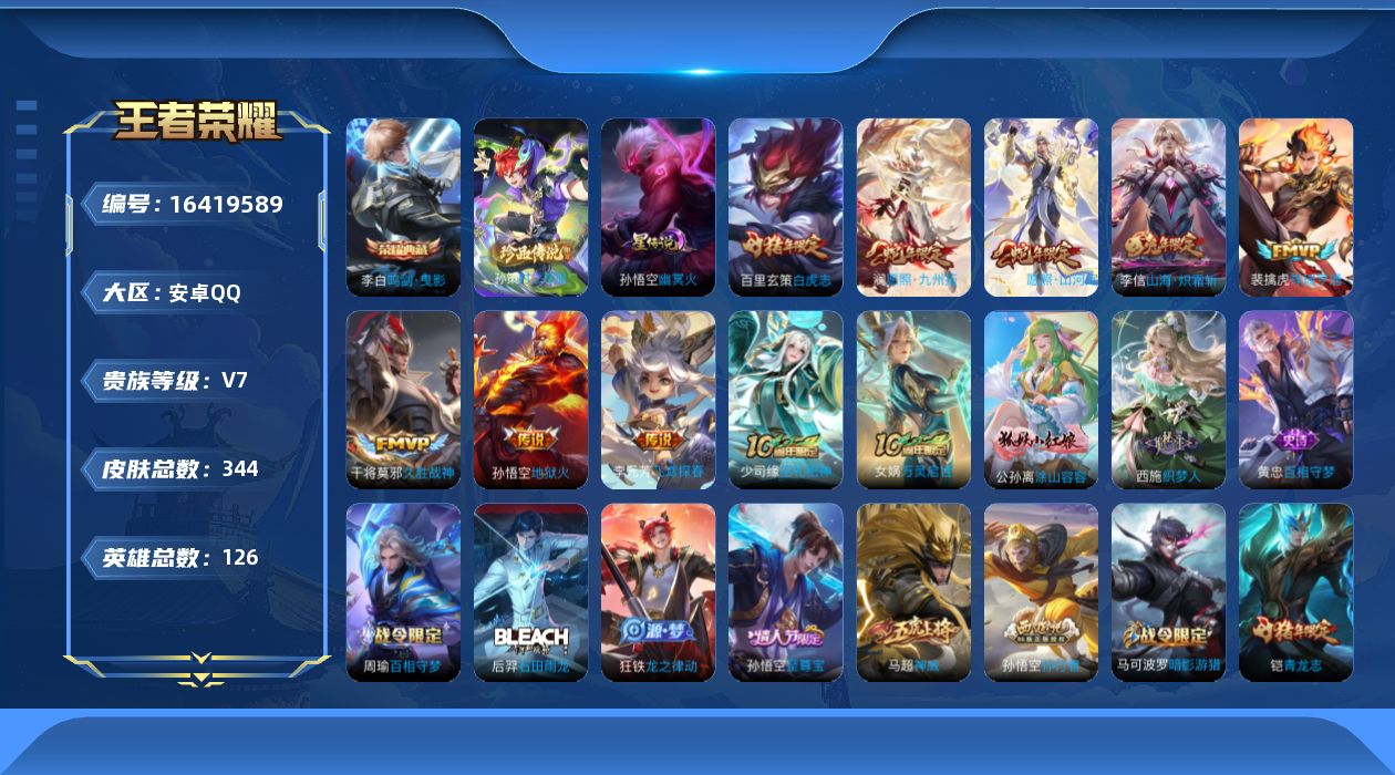 [16419589]【特价急出/详情看图】安卓Q-V7-最强王者段位-126英雄-344皮肤-1典藏皮肤-1珍品传说-1星元-9传说-94史诗