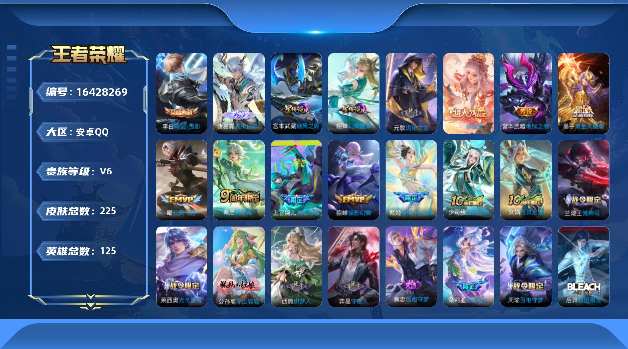 [16428269]【特价急出/详情看图】安卓Q-V6-至尊星耀IV段位-125英雄-225皮肤-1典藏皮肤-1无双-3星元-10传说-65史诗