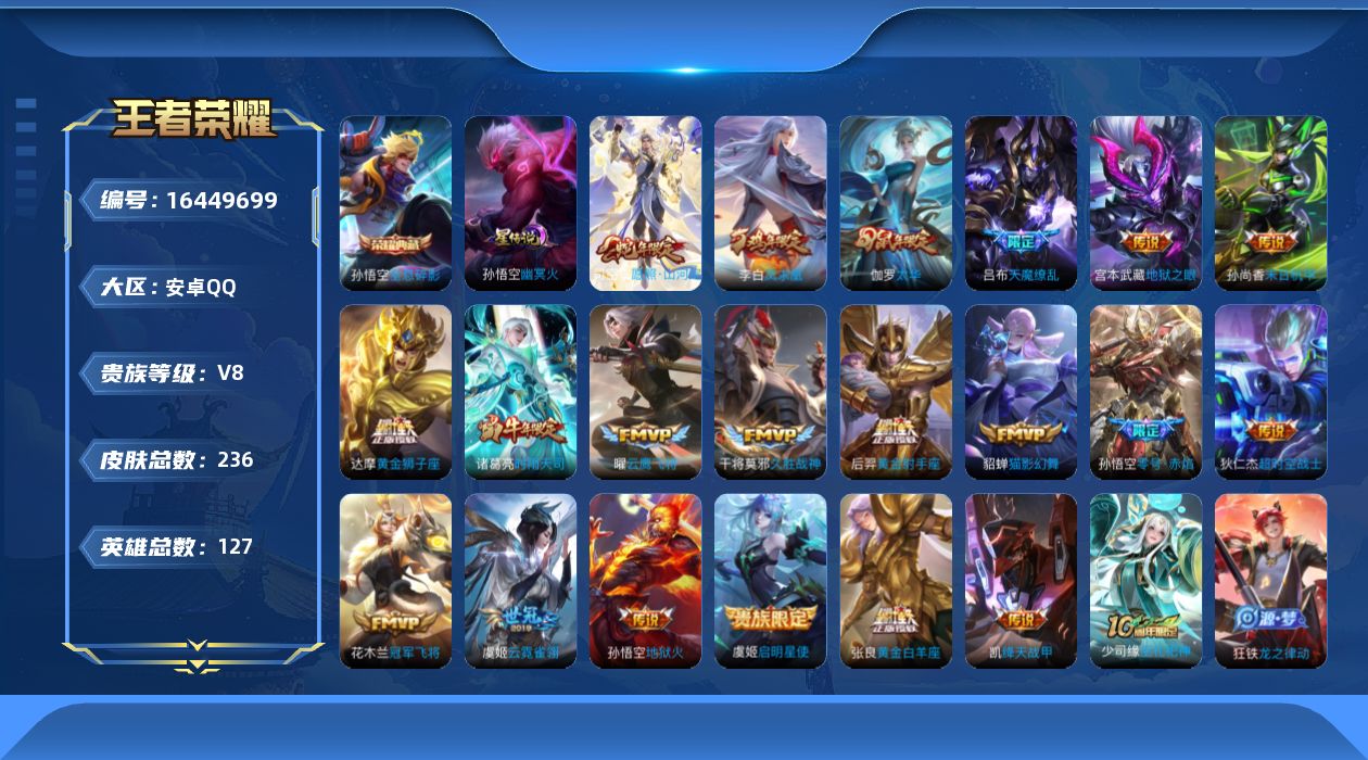 [16449699]【特价出售/店主推荐】:安卓Q-V8-至尊星耀IV段位-127英雄-236皮肤-1典藏皮肤-1星元-21传说-68史诗 【荣耀典藏】:孙悟空全息碎影 【传说皮肤】:后羿神树通天,司空震愿照山河定,诸葛亮时雨天司,铠绛天战甲,虞姬启明星使,孙悟空零号赤焰,曜云鹰飞将,伽罗太华,貂蝉猫影幻舞,张良黄金白羊座,干将莫邪久胜战神,虞姬云霓雀翎,达摩黄金狮子座,花木兰冠军飞将,后羿黄金射手座,李白凤求凰,孙尚香末日机甲,宫本武藏地狱之眼,孙悟空地狱火,吕布天魔缭乱,狄仁杰超时空战士 【限定皮肤】:狄仁杰阴阳师,赵云皇家上将,赵云龙胆,墨子神迹守卫,妲己时之彼端,嬴政白昼王子,孙尚香蔷薇恋人,庄周玄嵩,庄周高山流水,阿轲迷踪丽影,吕布天魔缭乱,吕布猎兽之王,元歌云间偶戏,元歌无心,夏侯惇朔风刀,甄姬幽恒,甄姬游园惊梦,曹操天狼征服者,典韦岱宗,马可波罗暗影游猎,狄仁杰魔术师,狄仁杰万华元夜,达摩沙漠行僧,项羽海滩派对,老夫子醍醐杖,老夫子航海奇遇记,关羽冰锋战神,程咬金演武夺筹,刘邦夺宝奇兵,韩信飞衡,王昭君凤凰于飞,兰陵王金庭之子,亚瑟潮玩骑士王,孙悟空至尊宝,孙悟空大圣娶亲,孙悟空零号赤焰,牛魔御旌,后羿辉光之辰,后羿如梦令,李元芳银河之约,李元芳云中旅人,虞姬启明星使,钟馗驱傩正仪,鬼谷子原初探秘者,鬼谷子五谷丰年,诸葛亮时雨天司,苏烈千军破阵,弈星混沌棋,沈梦溪星空之诺,沈梦溪大漠名商,明世隐疑决卦,裴擒虎李小龙,裴擒虎擒涛扼浪,米莱狄御霄,云中君纤云弄巧,伽罗太华,伽罗天狼溯光者,猪八戒西部大镖客,猪八戒猪悟能,嫦娥如梦令,嫦娥拒霜思,鲁班大师探海日志,桑启海盐诗旅,阿古朵江河有灵,张良古海寻踪,蒙犽百解令,鬼谷子天穹祈灯,姬小满妄想食味,沈梦溪龙舞盛年,刘邦剑破天穹,周瑜熔金海岸 【年限皮肤】:王昭君凤凰于飞,李白凤求凰,后羿辉光之辰,诸葛亮时雨天司,伽罗太华,甄姬幽恒,韩信飞衡,典韦岱宗,庄周玄嵩,赵云龙胆 【赛季限定】:夏侯惇朔风刀,狄仁杰万华元夜,达摩沙漠行僧,老夫子醍醐杖,程咬金演武夺筹,兰陵王金庭之子,张良古海寻踪,牛魔御旌,李元芳云中旅人,钟馗驱傩正仪,鬼谷子原初探秘者,苏烈千军破阵,弈星混沌棋,沈梦溪大漠名商,明世隐疑决卦,裴擒虎擒涛扼浪,米莱狄御霄,鲁班大师探海日志,桑启海盐诗旅,鬼谷子天穹祈灯,刘邦剑破天穹 【战令限定】:墨子神迹守卫,嬴政白昼王