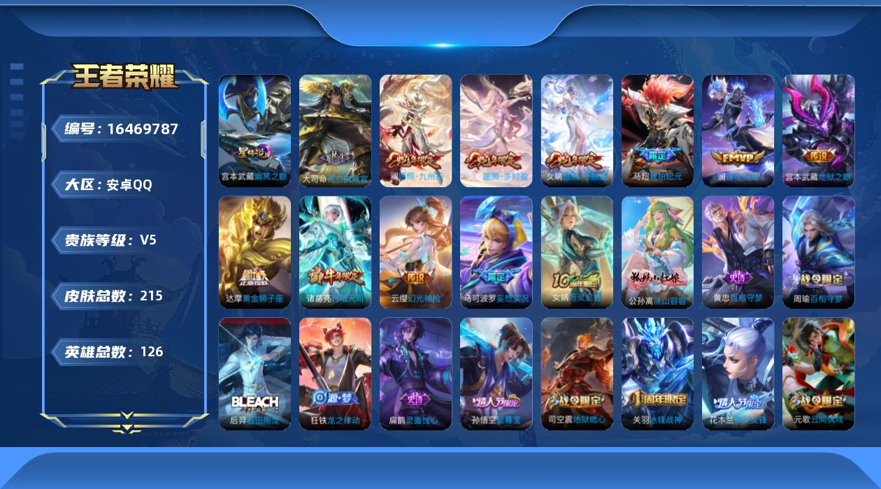 [16469787]可二次【特价出售/店主推荐】安卓Q-V5-最强王者段位-126英雄-215皮肤-1星传说-12传说-58史诗
