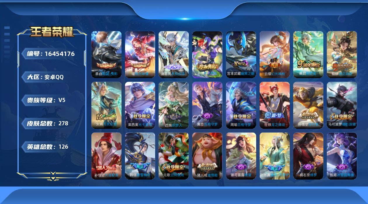 [16454176]【特价出售/店主推荐】:安卓Q-V7-永恒钻石II段位-126英雄-278皮肤-2典藏皮肤-1无双-1珍品传说-1星元-3传说-71史诗