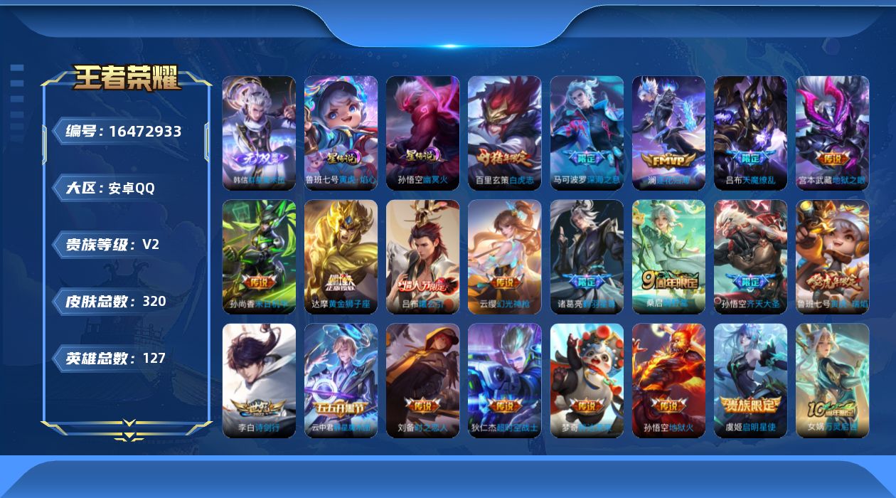 [16472933]可二次【特价出售/店主推荐】安卓Q-V2-至尊星耀III段位-127英雄-320皮肤-1无双-2星传说-20传说-87史诗