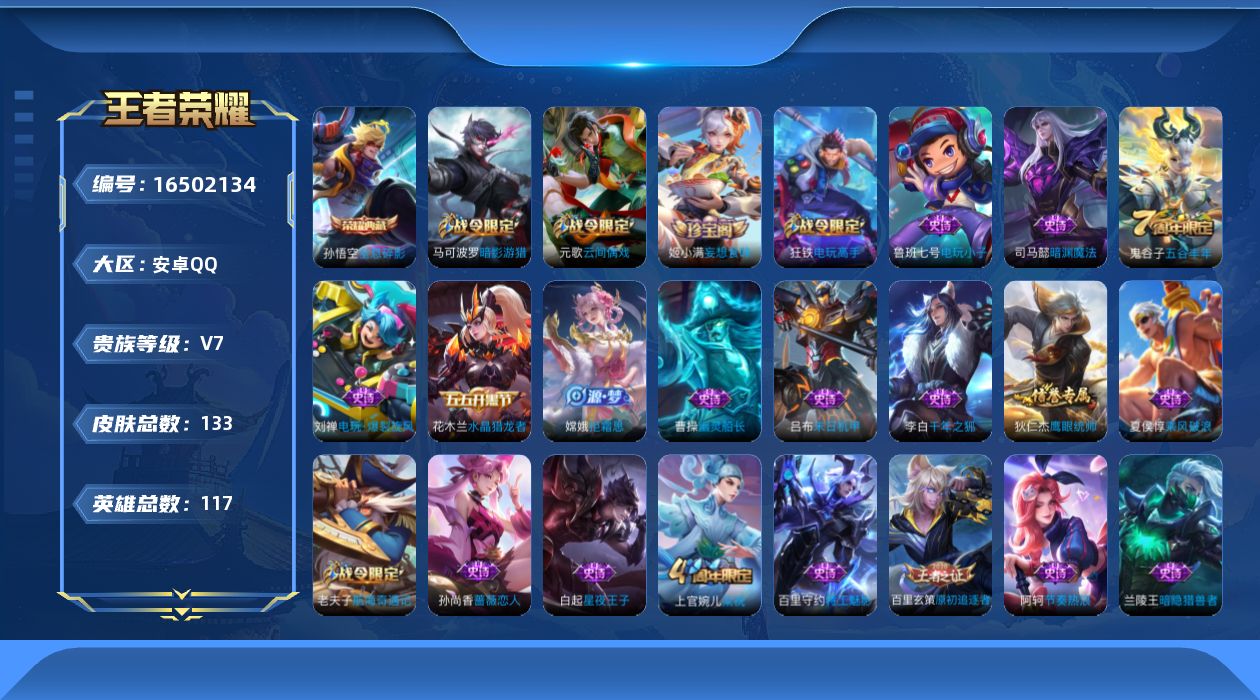 [16502134]【店主推荐捡漏号!可直接换绑】安卓Q-V7-尊贵铂金IV段位-117英雄-133皮肤-1典藏皮肤-41史诗 【荣耀典藏】:孙悟空全息碎影 【限定皮肤】:狄仁杰阴阳师,赵云皇家上将,墨子神迹守卫,孙尚香蔷薇恋人,庄周高山流水,芈月幻夜卜梦,元歌云间偶戏,夏侯惇朔风刀,马可波罗暗影游猎,狄仁杰魔术师,狄仁杰万华元夜,达摩星际陆战队,达摩沙漠行僧,项羽海滩派对,老夫子醍醐杖,老夫子航海奇遇记,程咬金演武夺筹,王昭君午后时光,亚瑟潮玩骑士王,后羿圣弓游侠,李元芳云中旅人,钟馗驱傩正仪,干将莫邪真爱魔法,雅典娜黎明之约,鬼谷子原初探秘者,鬼谷子五谷丰年,黄忠火炮绅士,苏烈千军破阵,百里玄策原初追逐者,弈星混沌棋,沈梦溪大漠名商,明世隐疑决卦,裴擒虎擒涛扼浪,狂铁电玩高手,米莱狄胡桃异想国,盾山御銮,猪八戒西部大镖客,上官婉儿梁祝,嫦娥拒霜思,鲁班大师探海日志,桑启海盐诗旅,张良古海寻踪,鬼谷子天穹祈灯,姬小满妄想食味 【赛季限定】:夏侯惇朔风刀,狄仁杰万华元夜,达摩沙漠行僧,老夫子醍醐杖,程咬金演武夺筹,张良古海寻踪,李元芳云中旅人,钟馗驱傩正仪,雅典娜黎明之约,鬼谷子原初探秘者,苏烈千军破阵,百里玄策原初追逐者,弈星混沌棋,沈梦溪大漠名商,明世隐疑决卦,裴擒虎擒涛扼浪,盾山御銮,鲁班大师探海日志,桑启海盐诗旅,鬼谷子天穹祈灯 【战令限定】:墨子神迹守卫,芈月幻夜卜梦,元歌云间偶戏,马可波罗暗影游猎,达摩星际陆战队,老夫子航海奇遇记,王昭君午后时光,亚瑟潮玩骑士王,后羿圣弓游侠,干将莫邪真爱魔法,黄忠火炮绅士,狂铁电玩高手,米莱狄胡桃异想国,猪八戒西部大镖客 【史诗皮肤】:鲁班七号电玩小子,项羽苍穹之光,赵云皇家上将,貂蝉圣诞恋歌,狄仁杰魔术师,孙尚香蔷薇恋人,孙尚香水果甜心,妲己魅力维加斯,墨子金属风暴,吕布圣诞狂欢,曹操幽灵船长,李白千年之狐,吕布末日机甲,张飞乱世虎臣,花木兰水晶猎龙者,刘邦德古拉伯爵,夏侯惇乘风破浪,兰陵王暗隐猎兽者,雅典娜冰冠公主,百里守约特工魅影,蔡文姬舞动绿茵,李元芳逐浪之夏,白起星夜王子,阿轲节奏热浪,狄仁杰鹰眼统帅,上官婉儿梁祝,马可波罗暗影游猎,百里玄策原初追逐者,元歌云间偶戏,米莱狄胡桃异想国,老夫子航海奇遇记,干将莫邪真爱魔法,庄周高山流水,司马懿暗渊魔法,嫦娥拒霜思,黄忠火炮绅士,雅典娜黎明之约,狂铁电玩高手,鬼谷子五谷丰年,刘禅电