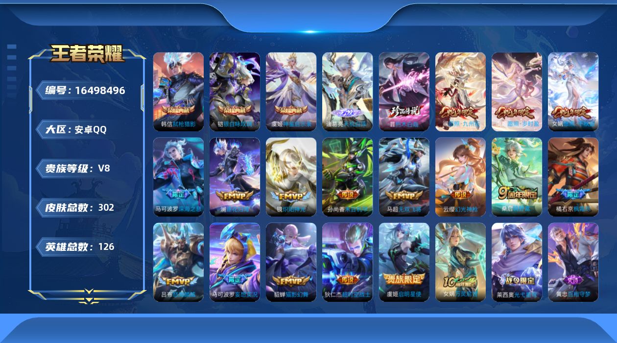 [16498496]账号来源干净 保证账号找回包赔 薄利多销 冲销量 平台保证金向商家安卓Q-V8-最强王者段位-126英雄-302皮肤-3典藏皮肤-1无双-1珍品传说-17传说-84史诗【英雄全皮】:戈娅全皮【荣耀典藏】:铠银白咏叹调,韩信弑枪猎影,虞姬神鉴启示录【无双皮肤】:诸葛亮天机白泽【珍品传说】:暃朽木白哉【传说皮肤】:后羿神树通天,女娲愿照千秋盛,澜愿照九州拓,虞姬愿照岁时盈,云缨幻光神枪,桑启鸣野蒿,澜逐花归海,马可波罗妄想实况,吕布怒海麟威,橘右京枫霜尽,马可波罗深海之息,马超无双飞将,镜炽阳神光,虞姬启明星使,貂蝉猫影幻舞,孙尚香末日机甲,狄仁杰超时空战士【限定皮肤】:蒙犽顽岩魄,蔡文姬夏日便利店,虞姬夏日便利店,姜子牙天穹之誓,杨戬破阵退雄兵,狄仁杰阴阳师,赵云皇家上将,赵云引擎之心,孙尚香蔷薇恋人,庄周高山流水,钟无艳王者之锤,元歌云间偶戏,马可波罗暗影游猎,马可波罗深海之息,马可波罗妄想实况,狄仁杰魔术师,狄仁杰万华元夜,达摩沙漠行僧,项羽海滩派对,老夫子醍醐杖,程咬金演武夺筹,王昭君午后时光,兰陵王驯魔猎人,兰陵王金庭之子,橘右京枫霜尽,孙悟空至尊宝,孙悟空孙行者,牛魔御旌,李元芳云中旅人,虞姬启明星使,钟馗驱傩正仪,杨玉环遇见飞天,雅典娜黎明之约,鬼谷子原初探秘者,鬼谷子五谷丰年,苏烈千军破阵,百里守约朱雀志,弈星混沌棋,沈梦溪大漠名商,明世隐疑决卦,裴擒虎李小龙,裴擒虎擒涛扼浪,狂铁电玩高手,米莱狄御霄,云中君纤云弄巧,上官婉儿梁祝,西施玲珑珍味,蒙犽狂想玩偶喵,鲁班大师探海日志,桑启海盐诗旅,戈娅驭风魔法,阿古朵江河有灵,张良古海寻踪,蒙犽百解令,鬼谷子天穹祈灯,伽罗琥珀纪元,姬小满妄想食味,沈梦溪龙舞盛年,刘邦剑破天穹,程咬金群星魔术团,镜青焰无极,项羽苍威无极,周瑜熔金海岸