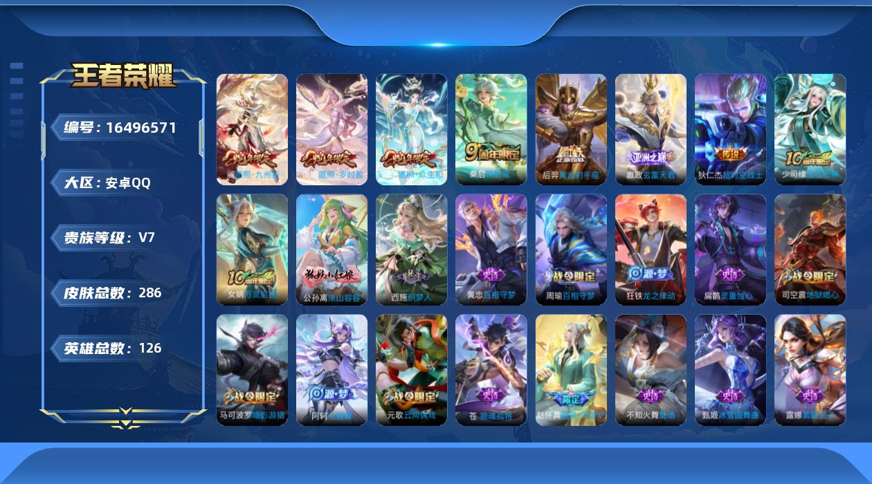 [16496571]安卓Q-V7-最强王者段位-126英雄-286皮肤-8传说-77史诗【英雄全皮】:苍全皮,影全皮【传说皮肤】:后羿神树通天,妲己愿照众生和,澜愿照九州拓,虞姬愿照岁时盈,嬴政玄雷天君,桑启鸣野蒿,后羿黄金射手座,狄仁杰超时空战士【限定皮肤】:白起狰,姜子牙天穹之誓,杨戬破阵退雄兵,狄仁杰阴阳师,虞姬凯尔特女王,赵云皇家上将,孙尚香蔷薇恋人,鲁班七号狮舞东方,庄周高山流水,高渐离玩趣恶龙,孙膑妖精王,芈月重明,元歌云间偶戏,元歌无心,夏侯惇朔风刀,典韦穷奇,马可波罗暗影游猎,狄仁杰魔术师,狄仁杰万华元夜,达摩星际陆战队,达摩沙漠行僧,项羽海滩派对,老夫子醍醐杖,貂蝉逐梦之音,程咬金演武夺筹,兰陵王金庭之子,亚瑟潮玩骑士王,牛魔御旌,李元芳云中旅人,钟馗神迹守卫,钟馗驱傩正仪,干将莫邪胡桃夹子,蔡文姬繁星吟游,鬼谷子原初探秘者,鬼谷子五谷丰年,苏烈千军破阵,弈星混沌棋,梦奇顽趣,沈梦溪星空之诺,沈梦溪大漠名商,明世隐疑决卦,裴擒虎擒涛扼浪,狂铁御狮,米莱狄御霄,米莱狄胡桃异想国,云中君纤云弄巧,盾山御銮,猪八戒西部大镖客,嫦娥拒霜思,鲁班大师探海日志,桑启海盐诗旅,艾琳流音漫舞,司空震地狱燃心,阿古朵江河有灵,张良古海寻踪,蒙犽百解令,鬼谷子天穹祈灯,沈梦溪龙舞盛年,刘邦剑破天穹,程咬金群星魔术团,芈月浮光幕影,周瑜熔金海岸【赛季限定】:孙膑妖精王,白起狰,芈月重明,夏侯惇朔风刀,典韦穷奇,狄仁杰万华元夜,达摩沙漠行僧,老夫子醍醐杖,程咬金演武夺筹,兰陵王金庭之子,张良古海寻踪,牛魔御旌,李元芳云中旅人,虞姬凯尔特女王,钟馗驱傩正仪,鬼谷子原初探秘者,苏烈千军破阵,弈星混沌棋,梦奇顽趣,沈梦溪大漠名商,明世隐疑决卦,裴擒虎擒涛扼浪,狂铁御狮,米莱狄御霄,盾山御銮,鲁班大师探海日志,桑启海盐诗旅,鬼谷子天穹祈灯,刘邦剑破天穹,姜子牙天穹之誓【战令限定】:鲁班七号狮舞东方,元歌云间偶戏,马可波罗暗影游猎,达摩星际陆战队,艾琳流音漫舞,亚瑟潮玩骑士王,钟馗神迹守卫,沈梦溪星空之诺,米莱狄胡桃异想国,猪八戒西部大镖客,司空震地狱燃心【史诗皮肤】:露娜紫霞仙子,赵云皇家上将,赵云未来纪元,貂蝉圣诞恋歌,甄姬冰雪圆舞曲,王昭君偶像歌手,狄仁杰魔术师,廉颇地狱岩魂,宫本武藏鬼剑武藏,孙尚香蔷薇恋人,孙尚香水果甜心,嬴政摇滚巨星,妲己魅力维加斯,妲己女仆咖啡,墨子金属风暴,吕布圣诞狂