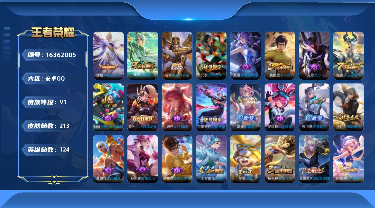 [16362005]【店主推荐捡漏号!可直接换绑】安卓Q-V4-最强王者段位中路38段发育路31段-122英雄-213皮肤-1典藏皮肤-2传说-42史诗
