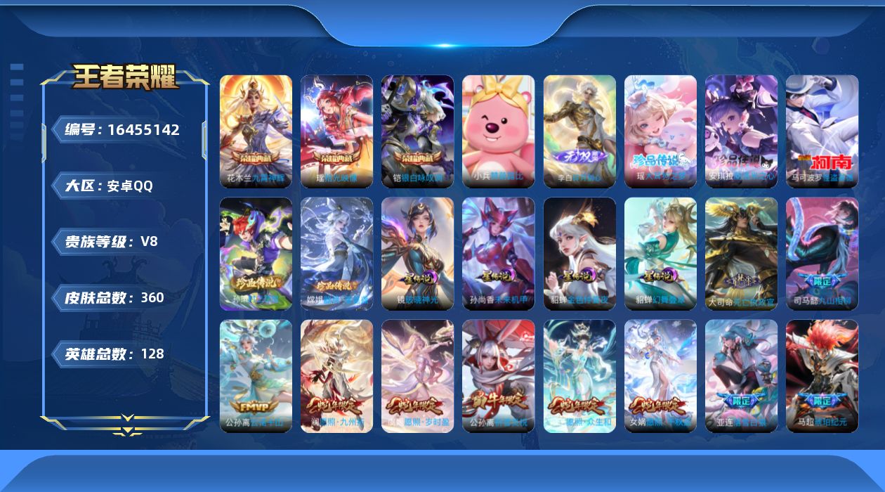 [16455142]可二次【特价出售/店主推荐】安卓Q-V8-至尊星耀II段位-127英雄-356皮肤-3典藏皮肤-1无双-5珍品传说-4星传说-32传说-108史诗