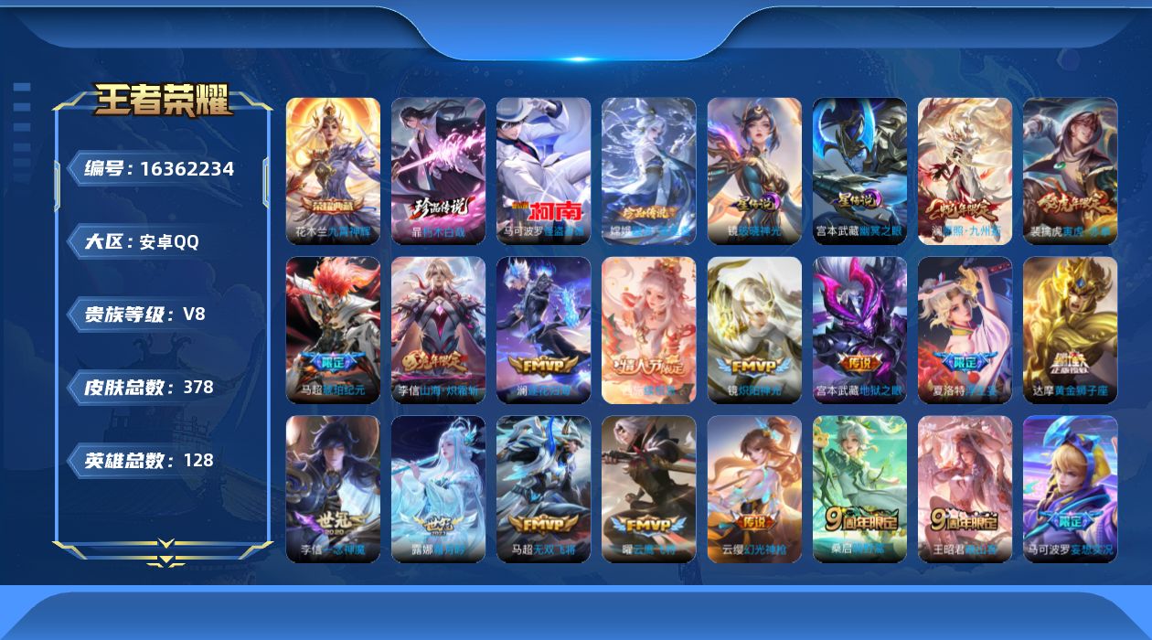 [16362234]【店主推荐捡漏号!可直接换绑】安卓Q-V8-至尊星耀I段位44段打野42段对抗路-128英雄-378皮肤-1典藏皮肤-3珍品传说-21传说-120史诗-2星元 【英雄全皮】:孙权全皮,狂铁全皮,李信全皮,马超全皮,镜全皮,暃全皮,戈娅全皮,影全皮,海诺全皮,姬小满全皮 【荣耀典藏】:花木兰九霄神辉 【珍品传说】:马可波罗怪盗基德,嫦娥器灵落星盏,暃朽木白哉 【传说皮肤】:西施续相思,澜愿照九州拓,云缨幻光神枪,王昭君映山客,桑启鸣野蒿,马超琥珀纪元,澜逐花归海,露娜霜月吟,马可波罗妄想实况,夏洛特浮生妄,项羽无限倾心,李信山海炽霜斩,马超无双飞将,裴擒虎寅虎赤拳,镜炽阳神光,虞姬启明星使,孙悟空零号赤焰,曜云鹰飞将,李信一念神魔,达摩黄金狮子座,宫本武藏地狱之眼 【限定皮肤】:暃埋骨钱,蒙犽顽岩魄,蔡文姬夏日便利店,大乔绒语心约,姜子牙天穹之誓,李白谪仙醉月,狄仁杰阴阳师,赵云皇家上将,嬴政优雅恋人,庄周高山流水,高渐离死亡摇滚,高渐离玩趣恶龙,阿轲迷踪丽影,白起夜都怪侠,芈月幻夜卜梦,吕布御风骁将,元歌云间偶戏,元歌无心,典韦穷奇,马可波罗山海玄木吟,马可波罗妄想实况,狄仁杰魔术师,狄仁杰万华元夜,达摩沙漠行僧,项羽海滩派对,项羽无限倾心,老夫子醍醐杖,关羽冰锋战神,程咬金演武夺筹,韩信傲雪梅枪,王昭君午后时光,兰陵王金庭之子,亚瑟潮玩骑士王,孙悟空零号赤焰,孙悟空孙行者,牛魔御旌,后羿如梦令,后羿圣弓游侠,李元芳匿光侦查者,李元芳云中旅人,虞姬启明星使,钟馗驱傩正仪,杨玉环遇见飞天,干将莫邪真爱魔法,雅典娜黎明之约,蔡文姬繁星吟游,太乙真人华丽摇滚,鬼谷子原初探秘者,鬼谷子五谷丰年,黄忠火炮绅士,苏烈千军破阵,百里玄策原初追逐者,弈星混沌棋,梦奇顽趣,公孙离玉兔公主,沈梦溪大漠名商,明世隐疑决卦,明世隐吟游魔法,裴擒虎李小龙,裴擒虎寅虎赤拳,裴擒虎擒涛扼浪,狂铁御狮,狂铁电玩高手,云中君纤云弄巧,李信山海炽霜斩,盾山御銮,猪八戒猪悟能,上官婉儿神器万象笔,嫦娥拒霜思,嫦娥暖冬兔眠,西施玲珑珍味,西施至美乘鲤谣,鲁班大师探海日志,镜匿光追影者,桑启海盐诗旅,夏洛特浮生妄,暃星界游侠,戈娅驭风魔法,艾琳流音漫舞,司空震地狱燃心,阿古朵江河有灵,张良古海寻踪,蒙犽百解令,蒙恬荣光圣徽,鬼谷子天穹祈灯,伽罗琥珀纪元,马超琥珀纪元,姬小满妄想食味,百里玄策超元猎域,沈梦