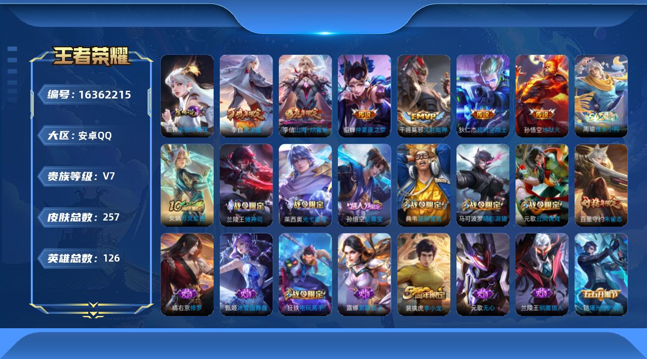 [16362215]【特价出售/店主推荐/1市标/30段打野】:安卓Q-V7-永恒钻石I段位-126英雄-257皮肤-1星元-7传说-61史诗