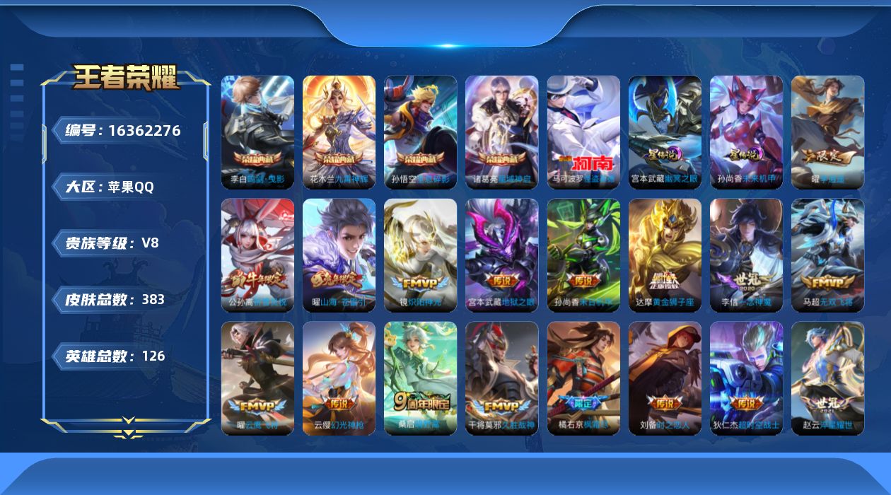 [16362276]【店主推荐捡漏号!可直接换绑】苹果Q-V8-永恒钻石II段位36段打野31段发育路-126英雄-383皮肤-4典藏皮肤-1珍品传说-19传说-110史诗-3星元