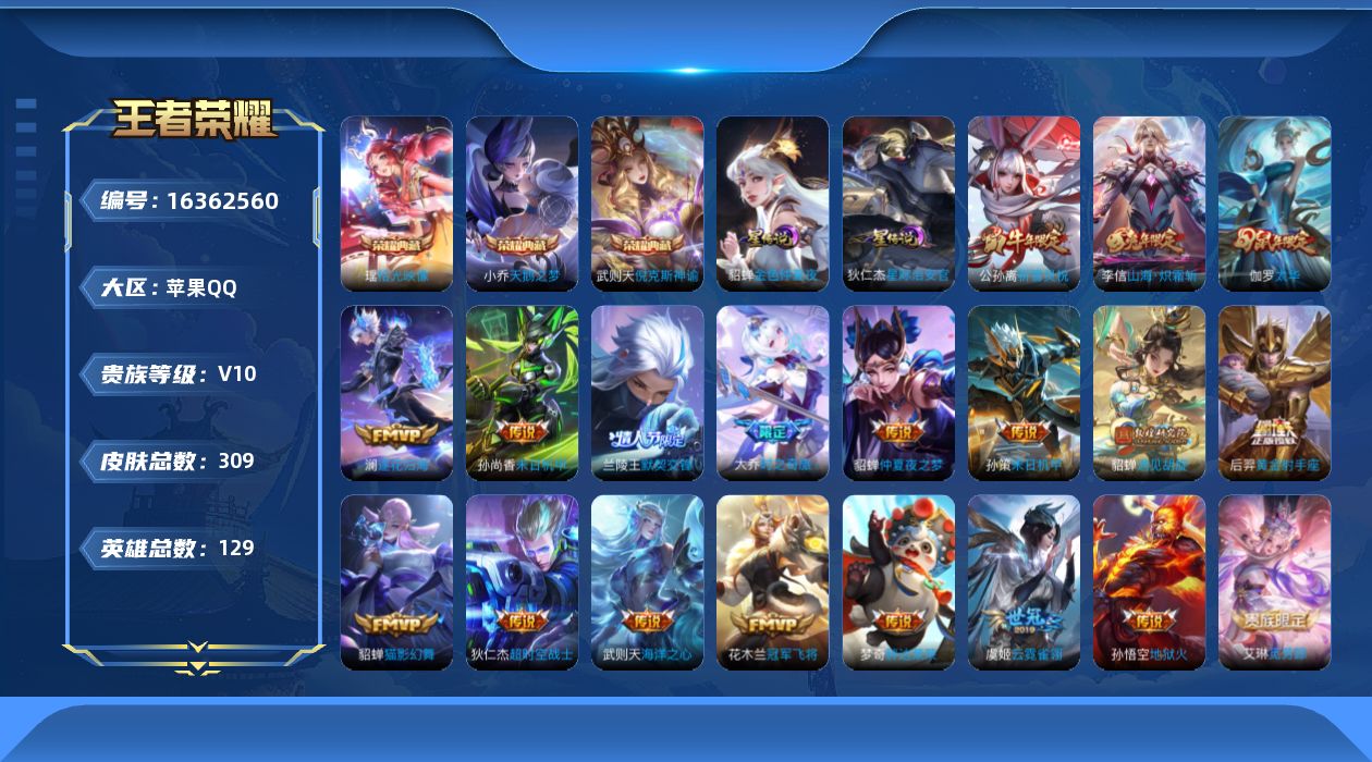 - [12174111]V10 3典藏 1珍品无双 2无双 7珍品传说 49传说 123英雄 465皮肤 可修改实名 女号 优质装备:馥梦繁花,天鹅之梦(小乔典藏),真我赫兹(瑶)(瑶无双),神鉴启示录,小乔时之魔女(小乔无双),拾光映像(瑶典藏),江户川柯南,器灵·落星盏,酷洛米之心,大耳狗之梦,朽木白哉,黑崎一护,黄金狮子座,黄金白羊座,猫影幻舞,炽阳神光,云霓雀翎,末日机甲-孙尚香(绿蚂蚱),仲夏夜之梦(大飞蛾),音你心动-小乔,飞鸢探春,乞巧织情,超时空战士-狄仁杰,花朝如约(花篮子),碎云,山海·琳琅生(小乔年限),炽翼辉光(娃娃菜牛角包),画中仙,浮生妄,记忆之芯(机甲兔),鹤羽星尊,灼幽烈阳,妄想实况,妄想奇谈,大乔-时之奇旅,小动物乐团,艾琳觅芳踪,朵莉亚心动手记,牧神诗旅 珍品传说:兔狲·蓬尾 传说皮:云诺千山,续相思,星之鸣奏,祥瑞亨通,幻光神枪 珍宝阁皮:蔷薇恋人,玩趣恶龙 限定皮:愿照·九州拓(澜年限),愿照·福禄聚(蔡文姬年限),愿照·岁时盈(虞姬年限),愿照·山河定(司空震年限),愿照·众生和(妲己年限),愿照·千秋盛(女娲年限),逐霄战戟,映山客,陌上桑,鸣野蒿,夏侯惇霜北刀,凤凰于飞,太华(伽罗年限),异界灵契(白毛香),寅虎·展翼(孙膑年限),前尘镜,星穹之声,时之彼端,魔法小厨娘,山海·碧波行(瑶年限),至美·化雀舞,遇见飞天,高山流水,五谷丰年,幽恒(沐浴露),天狼运算者,游园惊梦,梁祝,天狼溯光者,天狼绘梦者,霸王别姬-虞姬,奇迹圣诞,纯白花嫁,猪悟能,大圣娶亲,云端筑梦师,热情桑巴,女儿国国王,寅虎·心曲(虎婆),时之祈愿-瑶(瑶传限),启示之音,匿光启智者,时之奇旅-妲己,神器·万象笔,山海·玄木吟(马可年限) 史诗皮:赞萌露比,鸭鸭历险记-刘禅,苍鳞隐世,器灵·浮梦炉,糖绘人间,狼魂孤将,绮世丹青,瑰影绮梦,化蝶舞,龙之律动,灵蛊蚀心,雪豹·霜爪,星界战将,藏狐·褐绒,布丁狗之誓,小牛鸭,石田雨龙,百相守梦-周瑜,戍鼓铭心,茶境仙,埋骨钱,谪仙醉月,炽弈燎原,撼地雄心,破空之剑,战舞者,涂山红红,东方月初,芈月浮光幕影,怒海争锋,海诺心动手记,夜落电台,蔬乡物语(鲁班七号),幻珠鲛人,百相守梦-百里守约,遇见神鹿,紫霞仙子,电玩小子(小书包),黄金分割率,特工魅影,闲日渔趣,白蛇,匿光侦查者,雪夜绮愿(周瑜),青蛇,魅语,偶像歌手,