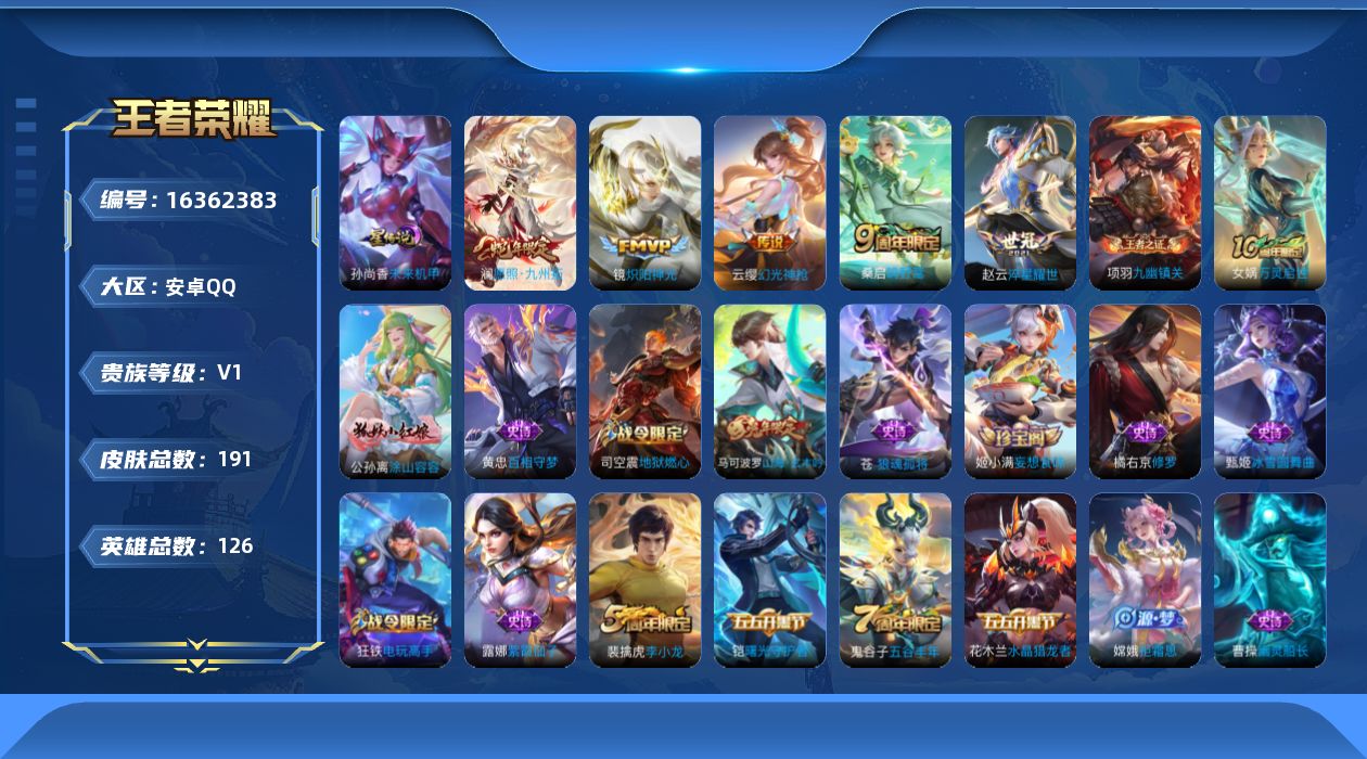 [16362383]【特价急出/详情看图】安卓Q-V1-永恒钻石III段位-126英雄-191皮肤-5传说-1星元-56史诗