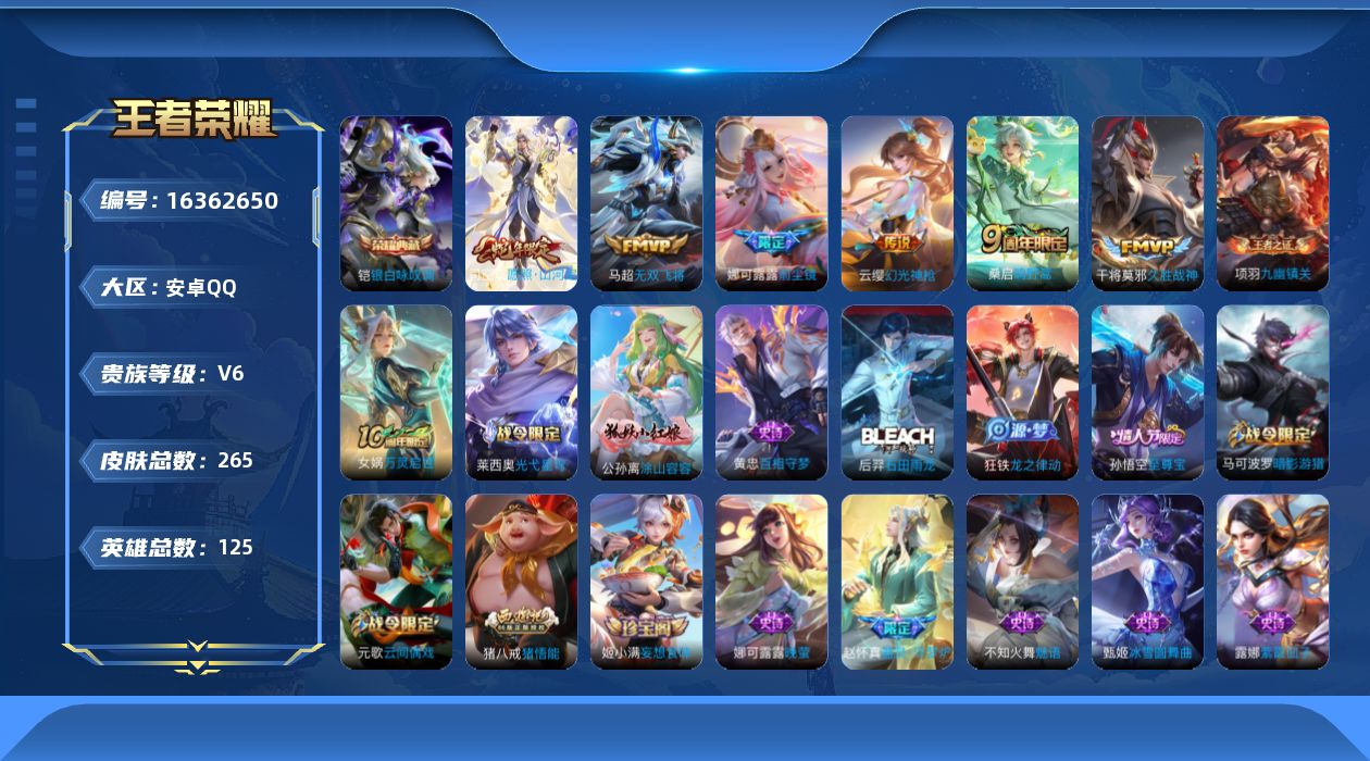 - [11525987]V8 1典藏 2珍品传说 14传说 125英雄 304皮肤 可修改实名 优质装备:最初的交响(伽罗典藏),江户川柯南,怪盗基德,黄金射手座,冠军飞将,一念神魔,地狱火,地狱之眼,飞鸢探春,游龙清影(小青龙),淬星耀世,超时空战士-狄仁杰 传说皮:云诺千山,幻光神枪 珍宝阁皮:优雅恋人,蔷薇恋人,玩趣恶龙 限定皮:愿照·岁时盈(虞姬年限),鸣野蒿,至尊宝,高山流水,匿光决锋者,五谷丰年,梁祝,天狼狩猎者,烈魂,天狼溯光者,朱雀志(守约年限),如梦令-后羿,孙行者,猪悟能,大圣娶亲,云端筑梦师 史诗皮:灵蛊蚀心,谪仙醉月,龙之律动,芈月浮光幕影,蔬乡物语(鲁班七号),百相守梦-黄忠,遇见神鹿,紫霞仙子,苍穹之光,电玩小子(小书包),黄金分割率,特工魅影,永昼,魅语,高渐离燃音魔法,无限星赏官,冰冠公主,晚萤,龙骑士(小龙虾),末日机甲-吕布,猫狗日记-孙策,时之恋人-孙尚香,乱世虎臣,节奏热浪,修罗,女仆咖啡,摇滚巨星,水果甜心,绅士熊喵,天才门将,星夜王子,时之奇旅-安琪拉,功夫厨神,德古拉伯爵,暗隐猎兽者,幽灵船长,鬼剑武藏,心灵战警,地狱岩魂,拒霜思,缤纷独角兽,乘风破浪,逐浪之夏,龙鼓争鸣,月团寄思,水晶猎龙者,曙光守护者,热力回旋,箭羽风息,金属风暴,圣诞狂欢,圣诞恋歌,鹰眼统帅,魅力维加斯,无心,未来纪元-赵云