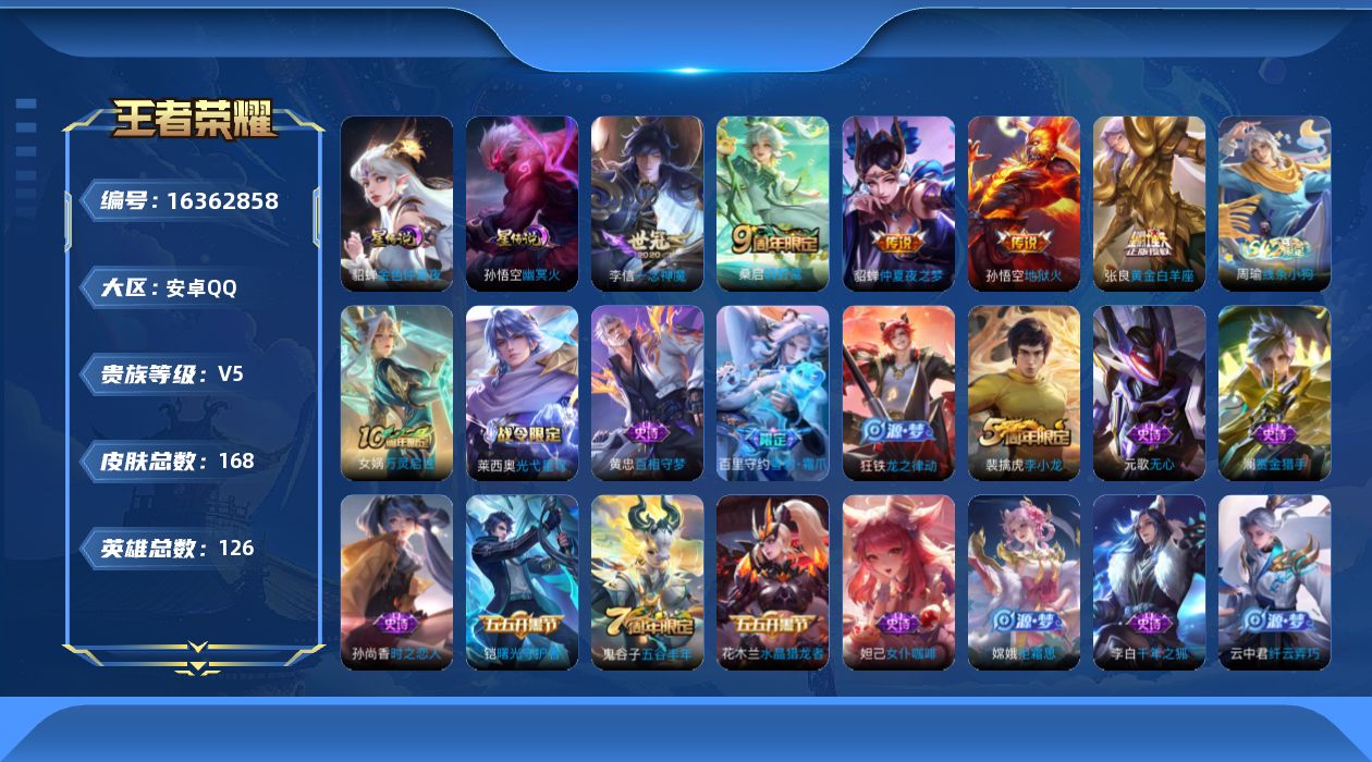 [16362858]可二次【特价出售/店主推荐】:安卓Q-V5-至尊星耀IV段位-126英雄-168皮肤-2星元-5传说-42史诗
