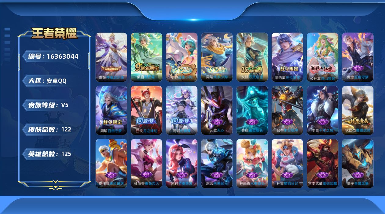 [16363044]【店主推荐捡漏号!可直接换绑】安卓Q-V5-最强王者段位-125英雄-122皮肤-1典藏皮肤-1传说-28史诗