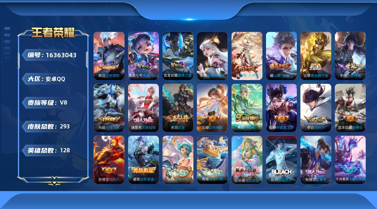 [16363043]【店主推荐捡漏号!可直接换绑】安卓Q-V8-永恒钻石III段位-128英雄-293皮肤-1典藏皮肤-15传说-91史诗-3星元