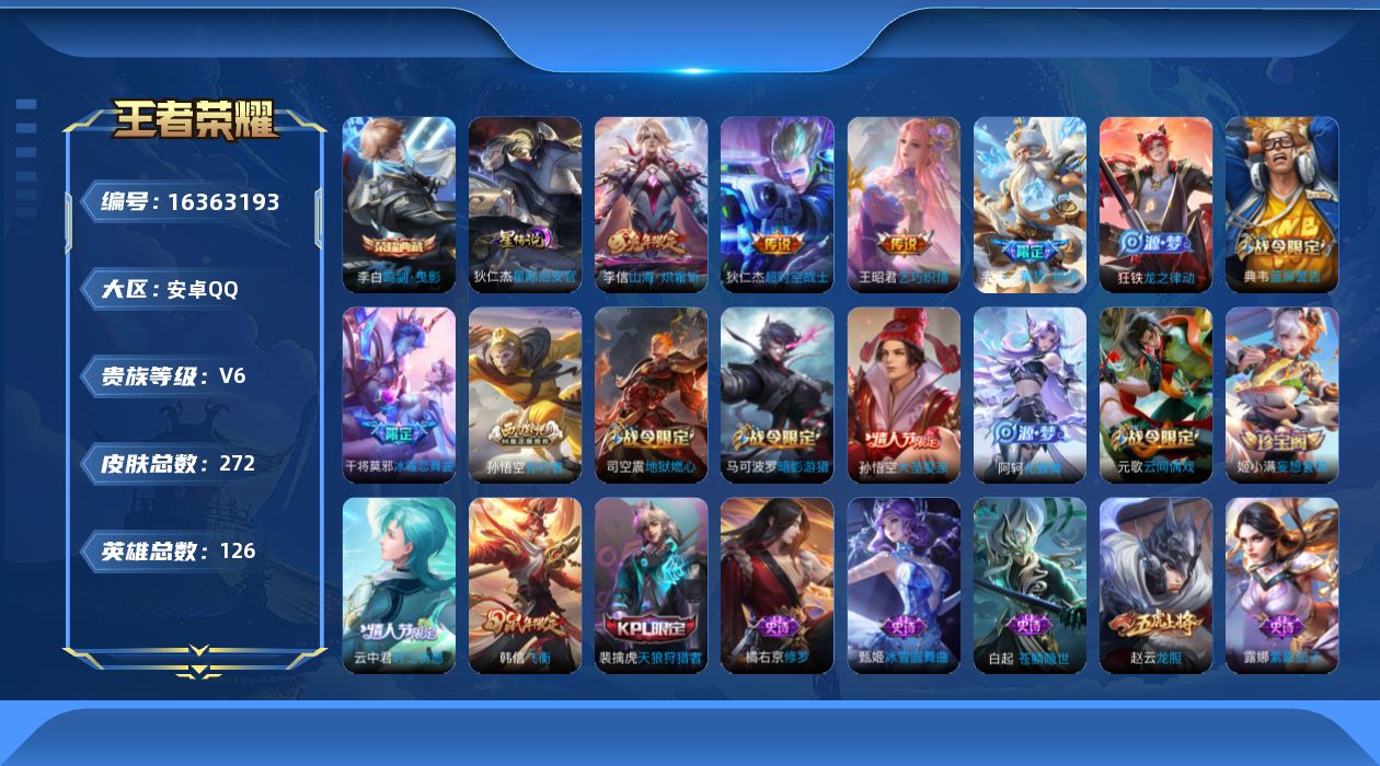 [16363193]【特价急出/详情看图】安卓Q-V6-永恒钻石II段位-126英雄-272皮肤-1典藏皮肤-1星元-3传说-78史诗