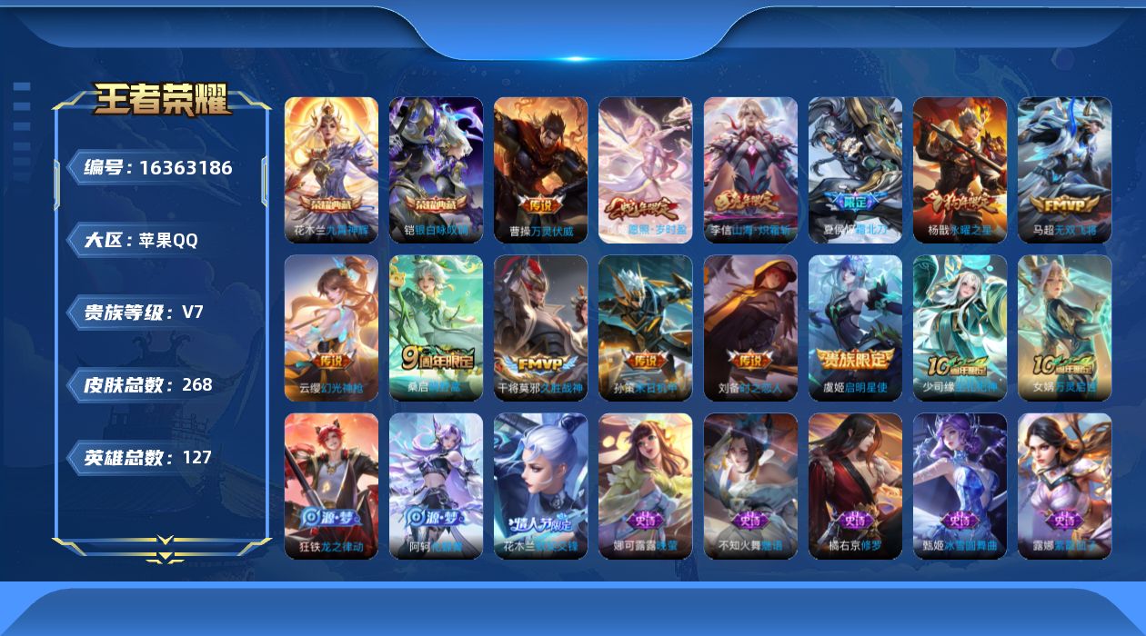 [16363186]可二次【特价出售/店主推荐 对抗路31段 1省标 1市标】苹果Q-V7-至尊星耀IV段位-127英雄-268皮肤-2典藏皮肤-12传说-1星传说-69史诗 【英雄全皮】:影全皮 【荣耀典藏】:花木兰九霄神辉,铠银白咏叹调 【传说皮肤】:曹操万灵伏威,虞姬愿照岁时盈,云缨幻光神枪,桑启鸣野蒿,夏侯惇霜北刀,李信山海炽霜斩,马超无双飞将,孙策末日机甲,虞姬启明星使,刘备时之恋人,干将莫邪久胜战神,杨戬永曜之星 【限定皮肤】:夏侯惇霜北刀,蔡文姬夏日便利店,虞姬夏日便利店,姜子牙天穹之誓,狄仁杰阴阳师,虞姬凯尔特女王,赵云皇家上将,嬴政优雅恋人,孙尚香蔷薇恋人,钟无艳超时空战士,扁鹊奇幻香踪,芈月重明,元歌无心,夏侯惇朔风刀,甄姬落雪兰心,曹操烛龙,典韦穷奇,狄仁杰魔术师,狄仁杰万华元夜,达摩沙漠行僧,项羽海滩派对,老夫子醍醐杖,程咬金演武夺筹,兰陵王金庭之子,花木兰默契交锋,牛魔御旌,李元芳云中旅人,虞姬启明星使,钟馗驱傩正仪,杨戬永曜之星,杨戬潮玩骑兵,女娲朔望之晖,雅典娜黎明之约,太乙真人饕餮,鬼谷子原初探秘者,鬼谷子五谷丰年,百里玄策原初追逐者,弈星混沌棋,梦奇顽趣,沈梦溪大漠名商,明世隐疑决卦,裴擒虎李小龙,裴擒虎擒涛扼浪,狂铁御狮,米莱狄御霄,李信山海炽霜斩,盾山御銮,嫦娥暖冬兔眠,鲁班大师探海日志,桑启海盐诗旅,暃星界游侠,张良古海寻踪,蒙恬荣光圣徽,高渐离燃音魔法,妲己灵卜魔法,鬼谷子天穹祈灯,鲁班七号蔬乡物语,李元芳蔬乡物语,刘邦剑破天穹,周瑜熔金海岸 【年限皮肤】:杨戬永曜之星,李信山海炽霜斩,虞姬愿照岁时盈 【赛季限定】:虞姬凯尔特女王,太乙真人饕餮,曹操烛龙,芈月重明,典韦穷奇,狂铁御狮,米莱狄御霄,牛魔御旌,盾山御銮,夏侯惇朔风刀,弈星混沌棋,明世隐疑决卦,老夫子醍醐杖,鬼谷子原初探秘者,狄仁杰万华元夜,程咬金演武夺筹,钟馗驱傩正仪,达摩沙漠行僧,兰陵王金庭之子,沈梦溪大漠名商,李元芳云中旅人,桑启海盐诗旅,裴擒虎擒涛扼浪,鲁班大师探海日志,张良古海寻踪,鬼谷子天穹祈灯,刘邦剑破天穹,姜子牙天穹之誓,太乙真人谧流熔炉,亚瑟荣光之誓,百里玄策原初追逐者,雅典娜黎明之约,梦奇顽趣,蒙恬荣光圣徽,牛魔星界战将 【战令限定】:女娲朔望之晖,钟无艳超时空战士,甄姬落雪兰心,暃星界游侠,嫦娥暖冬兔眠,扁鹊奇幻香踪,杨戬潮玩骑兵,高渐离燃音魔法,妲己灵卜魔法