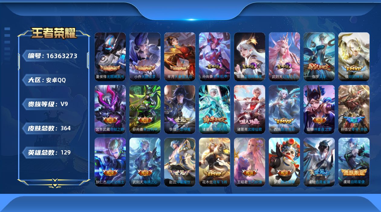 [16363273]【特价出售/店主推荐】金标芈月,安卓Q-V9-最强王者段位-129英雄-364皮肤-3典藏皮肤-1典藏英雄-3星传说-21传说-114史诗