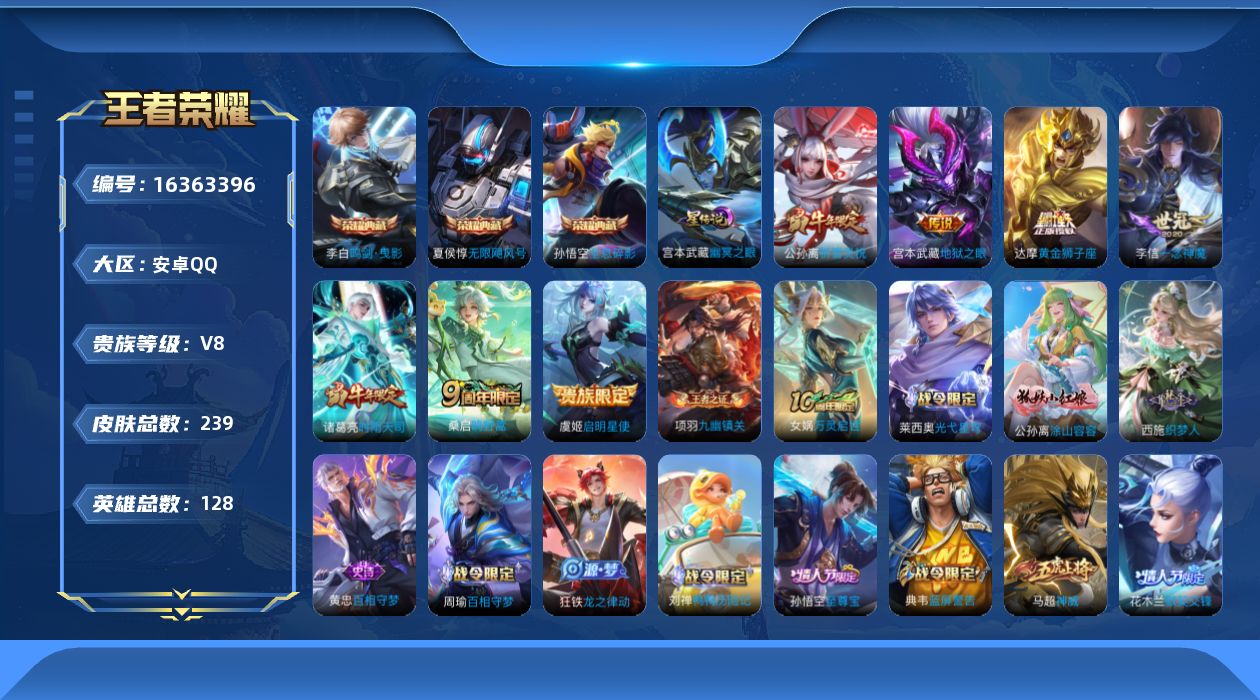 - [11824184]V9 2典藏 1无双 2珍品传说 18传说 126英雄 326皮肤 典藏英雄武则天 可修改实名 优质装备:无限飓风号(高达),神鉴启示录,天机白泽,朽木白哉,黑崎一护,黄金狮子座,黄金射手座,绛天战甲(鸡嘴战神),黄金白羊座,炽阳神光,一念神魔,云霓雀翎,末日机甲-孙尚香(绿蚂蚱),地狱火,地狱之眼 传说皮:落雪白狼,死亡执政官 珍宝阁皮:妄想食味,玩趣恶龙 限定皮:鸣野蒿,异界灵契(白毛香),瑞麟志(木兰年限),高山流水,五谷丰年,青龙志(铠年限),武圣,天狼运算者,梁祝,龙胆,烈魂,天狼溯光者,天狼绘梦者,李小龙,朱雀志(守约年限),辉光之辰,奇迹圣诞,孙行者,猪悟能,一生所爱,大圣娶亲,引擎之心,天魔缭乱,冰霜恋舞曲,乒乒小将,美猴王,寅虎·瑞焰(虎皮蛋子),时之祈愿-云中君,百木心枪,玉兔公主,时之奇旅-妲己 史诗皮:赞萌露比,鸭鸭历险记-刘禅,龙之律动,石田雨龙,百相守梦-周瑜,幻珠鲛人,琥珀纪元伽罗,守夜人,百相守梦-黄忠,苍穹之光,电玩小子(小书包),白龙吟,特工魅影,千年之狐,永昼,电玩·爆裂旋风,江河有灵,百解令(蒙犽),高渐离燃音魔法,偶像歌手,龙骑士(小龙虾),暗夜猫娘,魅语,无限星赏官,晚萤,冰冠公主,青蛇,时之恋人-孙尚香,乱世虎臣,节奏热浪,修罗,女仆咖啡,摇滚巨星,水果甜心,天才门将,星夜王子,心灵骇客,时之奇旅-安琪拉,功夫厨神,德古拉伯爵,幽灵船长,鬼剑武藏,心灵战警,舞动绿茵,地狱岩魂,纤云弄巧,繁星吟游(呼啦呼啦),缤纷独角兽,乘风破浪,逐浪之夏,水晶猎龙者,曙光守护者,箭羽风息,金属风暴,鹰眼统帅,暗夜贵公子,魅力维加斯,未来纪元-赵云