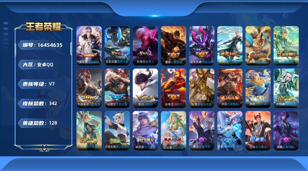 [16454635]可二次【特价出售/店主推荐/3626星币/6市标】:安卓Q-V7-至尊星耀I段位-128英雄-342皮肤-1典藏皮肤-2星元-11传说-107史诗