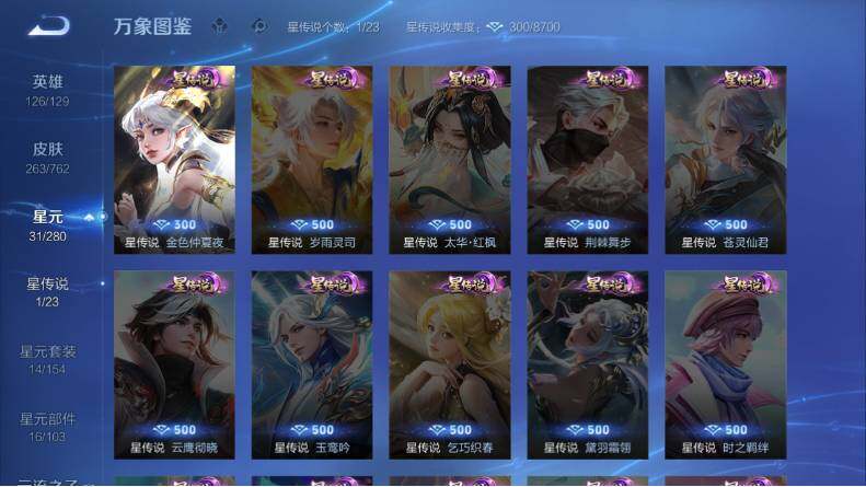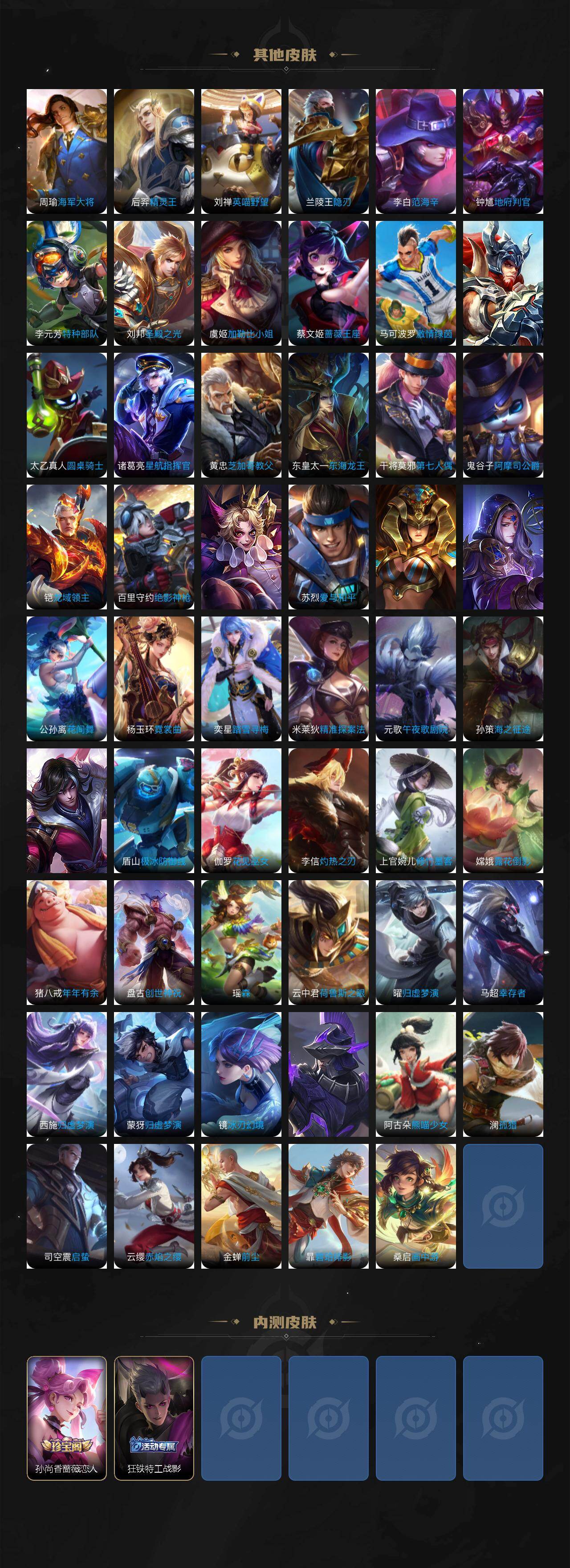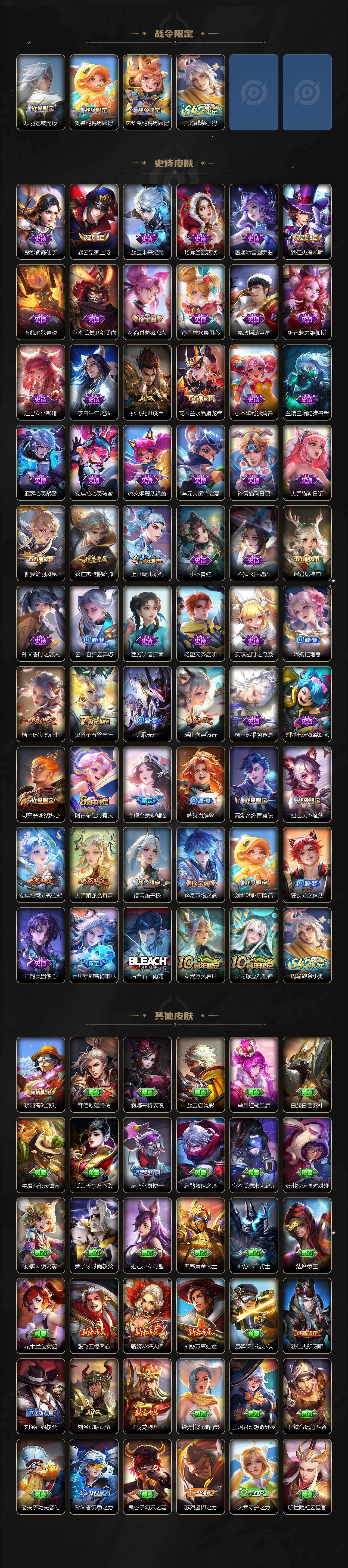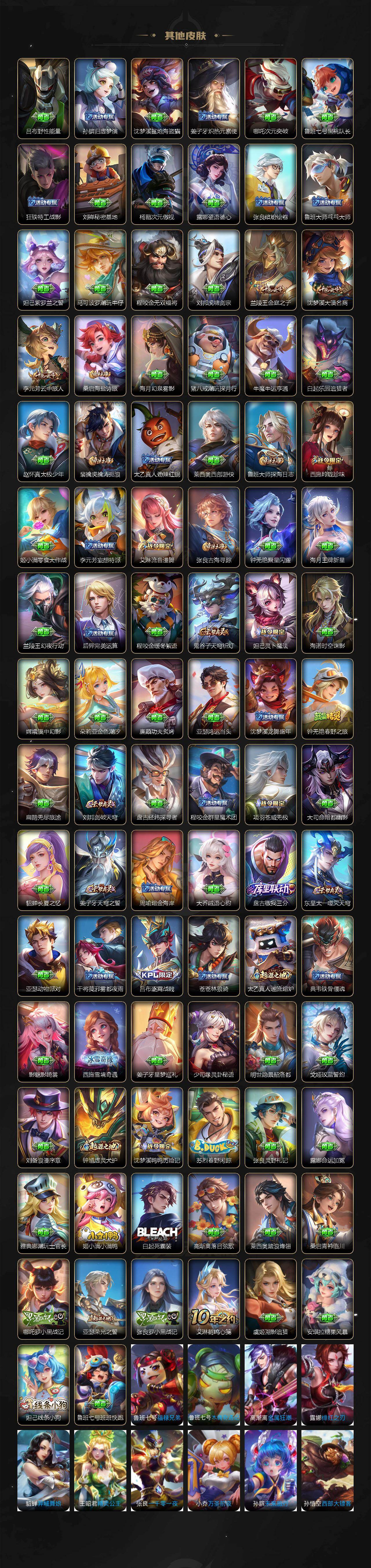 【限定皮肤】:大乔绒语心约,姜子牙天穹之誓,狄仁杰阴阳师,赵云皇家上将,孙尚香蔷薇恋人,鲁班七号寅虎瑞焰,元歌无心,甄姬至美化雀舞,马可波罗妄想实况,狄仁杰魔术师,项羽海滩派对,王昭君星穹之声,兰陵王金庭之子,李元芳云中旅人,杨玉环寅虎心曲,鬼谷子五谷丰年,沈梦溪大漠名商,裴擒虎擒涛扼浪,瑶山海碧波行,云中君纤云弄巧,上官婉儿梁祝,嫦娥拒霜思,西施玲珑珍味,西施至美乘鲤谣,鲁班大师探海日志,桑启海盐诗旅,艾琳流音漫舞,司空震地狱燃心,阿古朵江河有灵,张良古海寻踪,蒙犽百解令,高渐离燃音魔法,妲己灵卜魔法,鬼谷子天穹祈灯,大乔乘龙忆丹青,安琪拉乘龙聚宝船,沈梦溪龙舞盛年,刘邦剑破天穹,程咬金群星魔术团,镜青焰无极,项羽苍威无极,周瑜熔金海岸