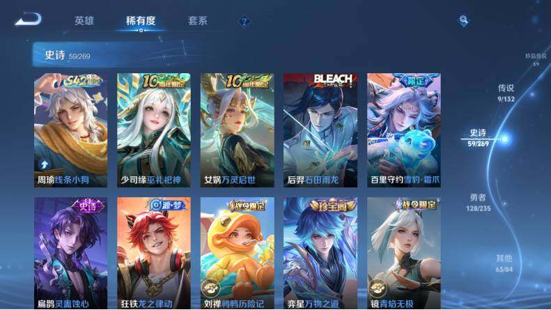 【赛季限定】:兰陵王金庭之子,沈梦溪大漠名商,李元芳云中旅人,桑启海盐诗旅,裴擒虎擒涛扼浪,鲁班大师探海日志,张良古海寻踪,鬼谷子天穹祈灯,刘邦剑破天穹,姜子牙天穹之誓,东皇太一噬灭天穹,太乙真人谧流熔炉,钟馗虚灵犬护,亚瑟荣光之誓