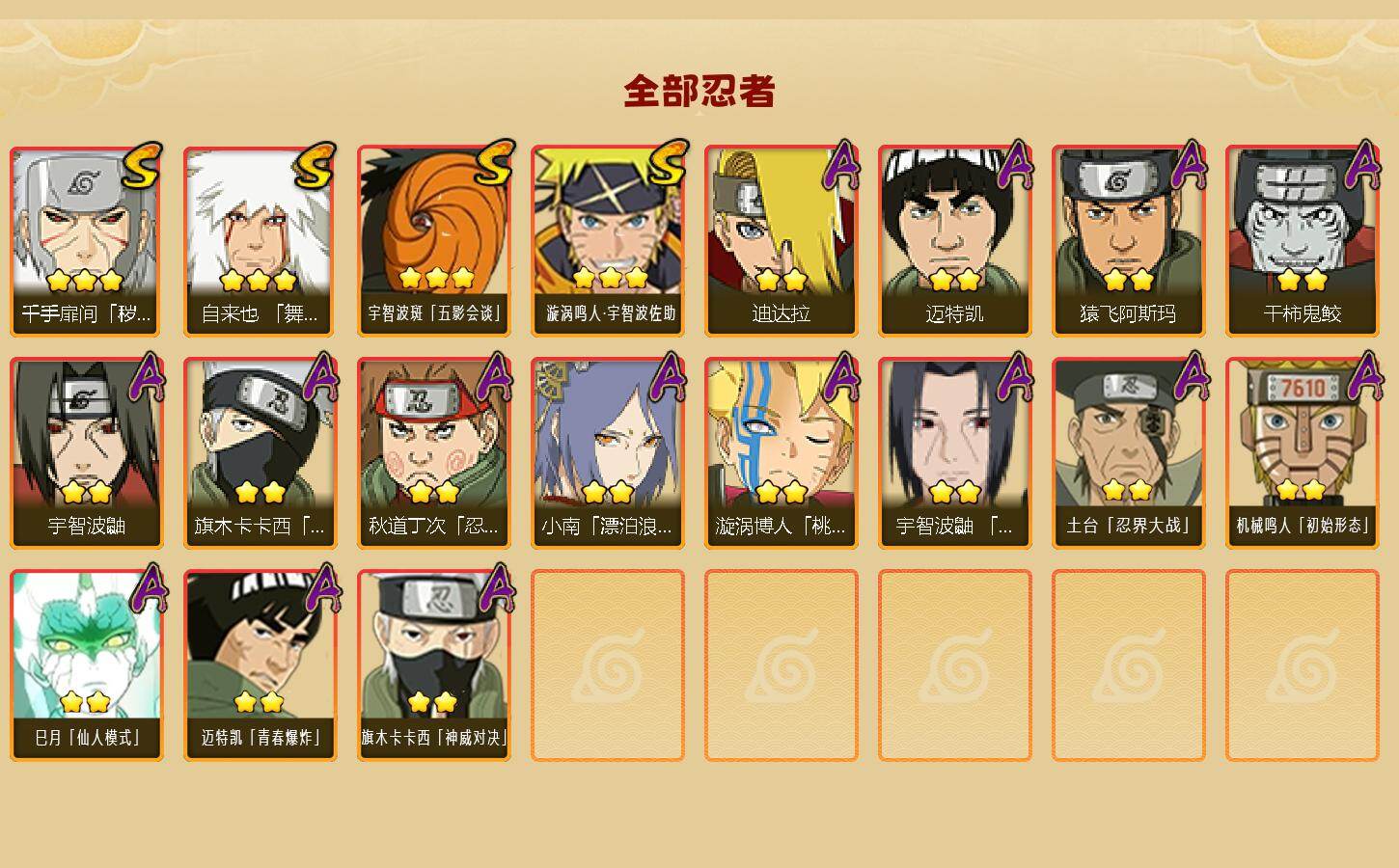 【S级忍者】:千手扉间「秽土转生」(3星),自来也「舞之豪杰」(3星),宇智波斑「五影会谈」(3星),漩涡鸣人·宇智波佐助(3星)