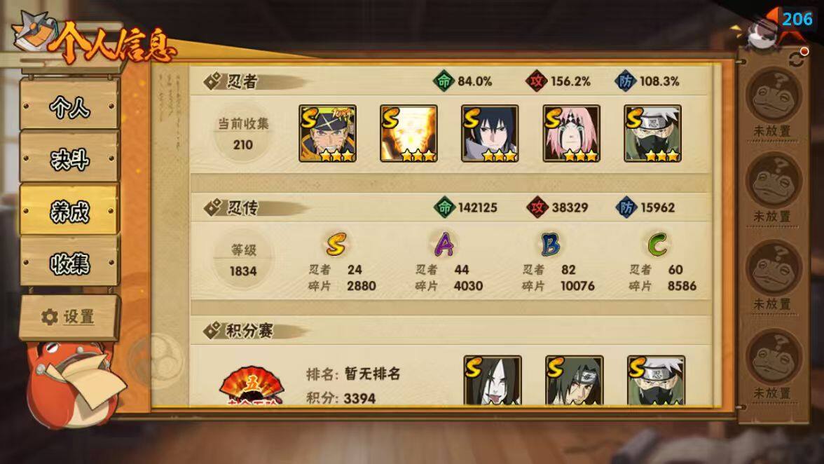 [16508824]24S级忍者数-44A级忍者数 【S级忍者】:千手柱间「秽土转生」(3星),宇智波鼬「秽土转生」(3星),宇智波斑「秽土转生·解」(3星),大野木「忍界大战」(3星),春野樱「忍界大战」(3星),宇智波带土「忍界大战」(3星),艾「忍界大战」(3星),宇智波鼬「须佐能乎」(3星),旗木卡卡西「须佐能乎」(3星),宇智波斑「木叶创立」(3星),千手柱间「木叶创立」(3星),自来也「舞之豪杰」(3星),大蛇丸(3星),波风水门(3星),漩涡鸣人「九喇嘛连结」(3星),迈特凯「死门」(3星),佩恩「天道」(3星),佩恩·天道「超」(3星),宇智波佐助「永恒万花筒」(3星),宇智波斑 「白面具」(3星宇智波斑「白面具」),大筒木金式(3星),大筒木桃式(3星),波风水门「九喇嘛连结」(3星),漩涡鸣人·宇智波佐助(3星) 【A级忍者】:艾「青年」(3星),长门「青年」(2星),波风水门「青年」(2星),达鲁伊「博人传」(2星),迪达拉(2星),迪达拉「秽土转生」(2星),奇拉比(2星),奇拉比「忍界大战」(2星),飞段(4星),飞段「死司凭血」(2星),干柿鬼鲛(5星),漩涡博人「桃式显现」(2星),机械鸣人「初始形态」(2星),迈特凯(5星),旗木卡卡西「幻之真容」(2星),桃地再不斩「秽土转生」(3星),我爱罗「疾风传」(4星),蝎(5星),蝎「绯流琥」(2星),小南「漂泊浪客」(2星),猿飞阿斯玛(5星),宇智波止水(2星),宇智波止水「新春限定」(2星),宇智波鼬(2星),宇智波鼬「夏日限定」(2星),宇智波佐助「万花筒写轮眼」(2星),宇智波佐助「侠隐江湖」(2星),药师兜「半蛇斗篷」(2星),照美冥「五代目水影」(2星),日向宁次「忍界大战」(2星),日向雏田「最终章」(2星),长十郎「六代目水影」(2星),神秘面具男「忍者之路」(2星),佩恩·六道「漂泊浪客」(2星),李洛克「忍界大战」(2星),千手扉间「漂泊武士」(2星),秋道丁次「忍界大战」(2星),千代「近松十人卫」(2星),土台「忍界大战」(2星),不缘(2星),宇智波泉奈(2星),不动(2星),大野木「侠隐江湖」(2星),迈特凯「青春爆炸」(2星)