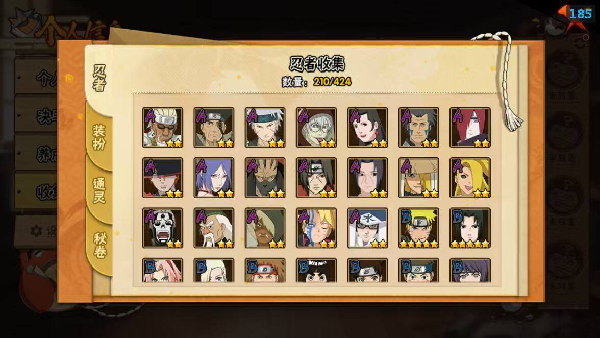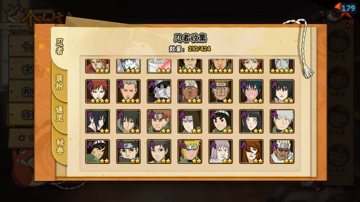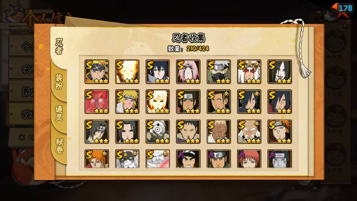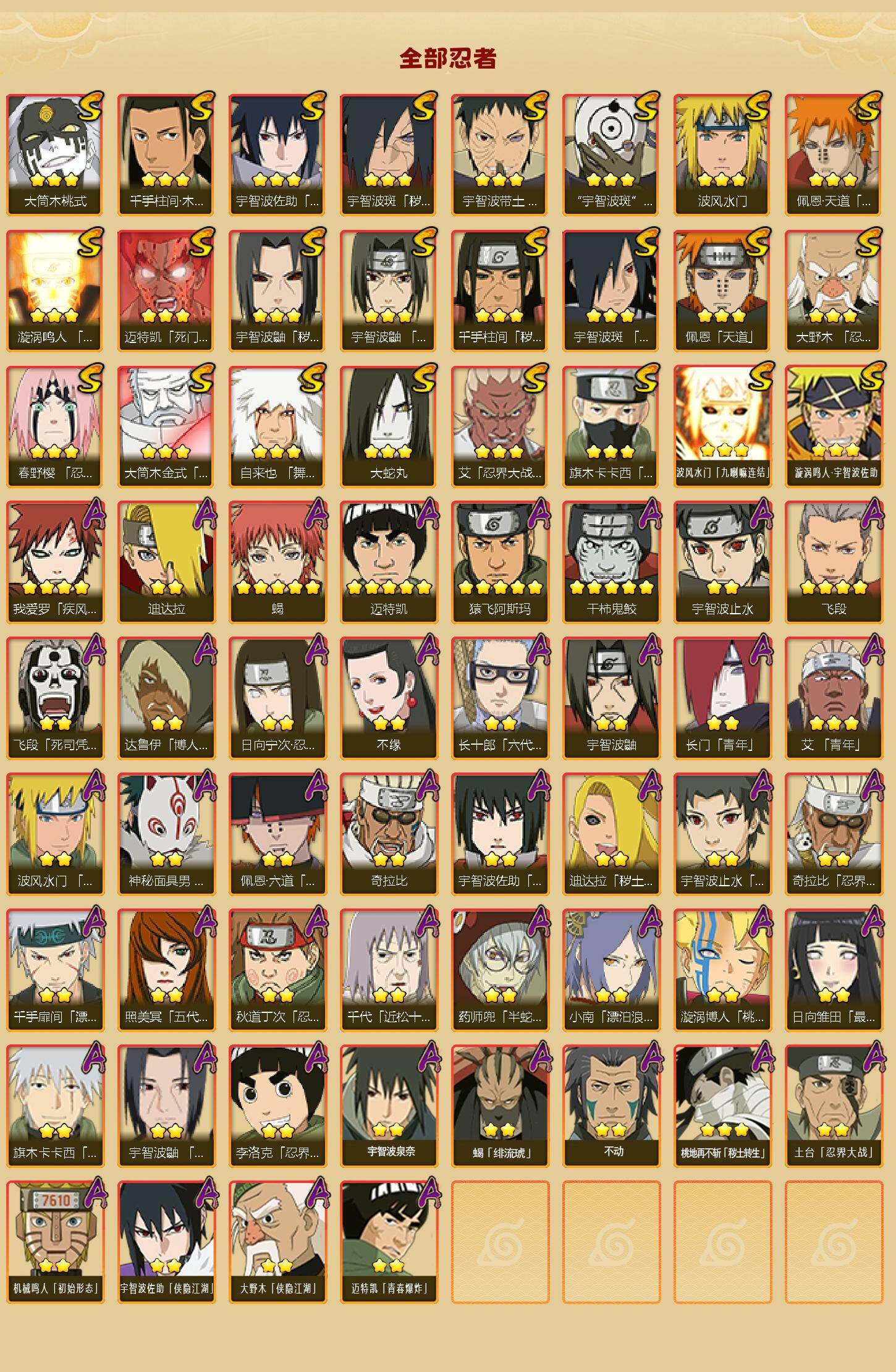 【A级忍者】:艾「青年」(3星),长门「青年」(2星),波风水门「青年」(2星),达鲁伊「博人传」(2星),迪达拉(2星),迪达拉「秽土转生」(2星),奇拉比(2星),奇拉比「忍界大战」(2星),飞段(4星),飞段「死司凭血」(2星),干柿鬼鲛(5星),漩涡博人「桃式显现」(2星),机械鸣人「初始形态」(2星),迈特凯(5星),旗木卡卡西「幻之真容」(2星),桃地再不斩「秽土转生」(3星),我爱罗「疾风传」(4星),蝎(5星),蝎「绯流琥」(2星),小南「漂泊浪客」(2星),猿飞阿斯玛(5星),宇智波止水(2星),宇智波止水「新春限定」(2星),宇智波鼬(2星),宇智波鼬「夏日限定」(2星),宇智波佐助「万花筒写轮眼」(2星),宇智波佐助「侠隐江湖」(2星),药师兜「半蛇斗篷」(2星),照美冥「五代目水影」(2星),日向宁次「忍界大战」(2星),日向雏田「最终章」(2星),长十郎「六代目水影」(2星),神秘面具男「忍者之路」(2星),佩恩·六道「漂泊浪客」(2星),李洛克「忍界大战」(2星),千手扉间「漂泊武士」(2星),秋道丁次「忍界大战」(2星),千代「近松十人卫」(2星),土台「忍界大战」(2星),不缘(2星),宇智波泉奈(2星),不动(2星),大野木「侠隐江湖」(2星),迈特凯「青春爆炸」(2星)
