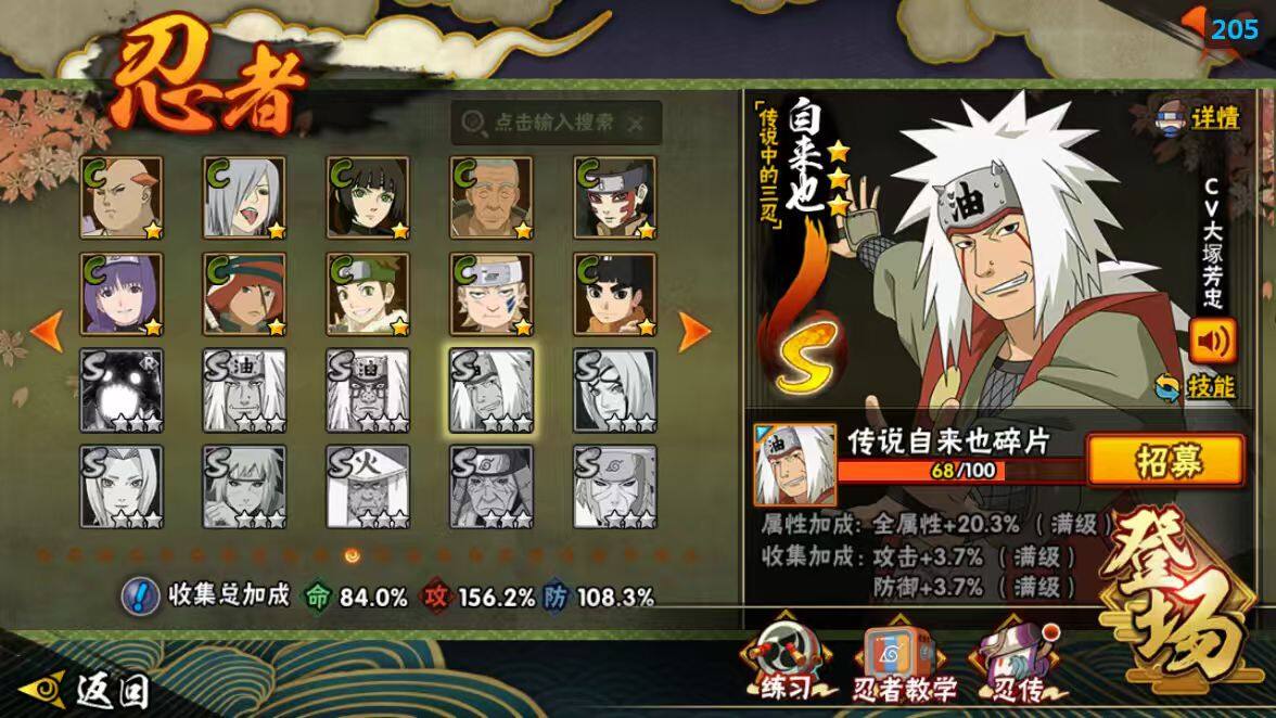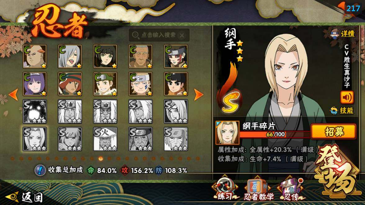 【S级忍者】:千手柱间「秽土转生」(3星),宇智波鼬「秽土转生」(3星),宇智波斑「秽土转生·解」(3星),大野木「忍界大战」(3星),春野樱「忍界大战」(3星),宇智波带土「忍界大战」(3星),艾「忍界大战」(3星),宇智波鼬「须佐能乎」(3星),旗木卡卡西「须佐能乎」(3星),宇智波斑「木叶创立」(3星),千手柱间「木叶创立」(3星),自来也「舞之豪杰」(3星),大蛇丸(3星),波风水门(3星),漩涡鸣人「九喇嘛连结」(3星),迈特凯「死门」(3星),佩恩「天道」(3星),佩恩·天道「超」(3星),宇智波佐助「永恒万花筒」(3星),宇智波斑 「白面具」(3星宇智波斑「白面具」),大筒木金式(3星),大筒木桃式(3星),波风水门「九喇嘛连结」(3星),漩涡鸣人·宇智波佐助(3星)